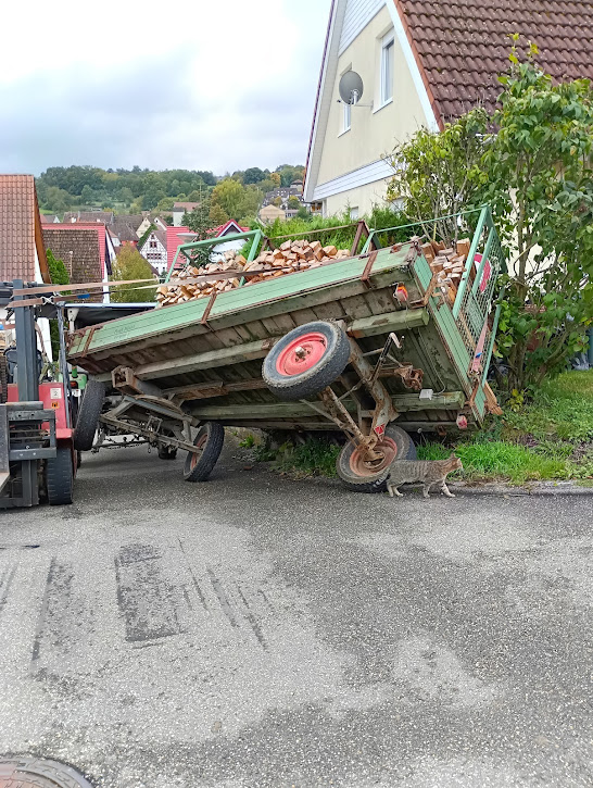 Weiß ja nicht, was der Gurt am Hubmast des Gabelstaplers erwirken soll, aber wenn der Anhänger auch nur noch ein bisschen nachgibt, dann liegt der Stapler auchHeute dem Nachbarn sein Brennholz geliefert:Anhang anzeigen 724296