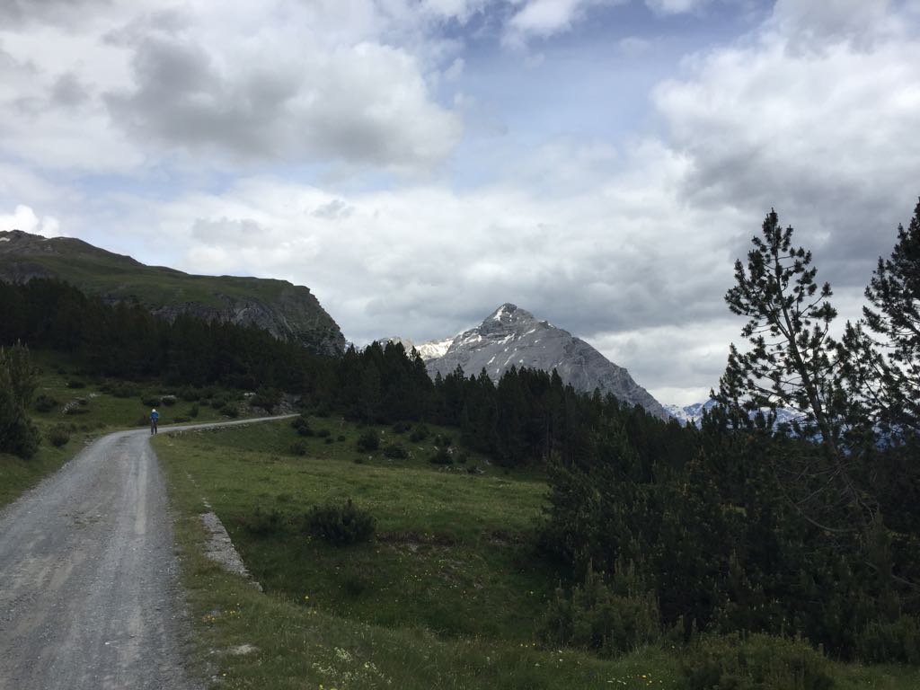 Damit’s nicht unlösbar ist, ein Hinweis: Der graue Berg in Bildmitte wird längs seiner Flanke bogenförmig umfahren vom Talort aus auf dem Weg zu zwei der bekannteren Alpenpässe. Auf der gezeigten Naturstraße kommt man direttissima auch dorthin, allerdings nur zu Fuß, mit dem Velo oder allenfalls mit einem ausgesprochen geländegängigen Fahrzeug (und vermutlich ist es auch irgendwann gesperrt - ich hab’s noch nie ausprobiert).