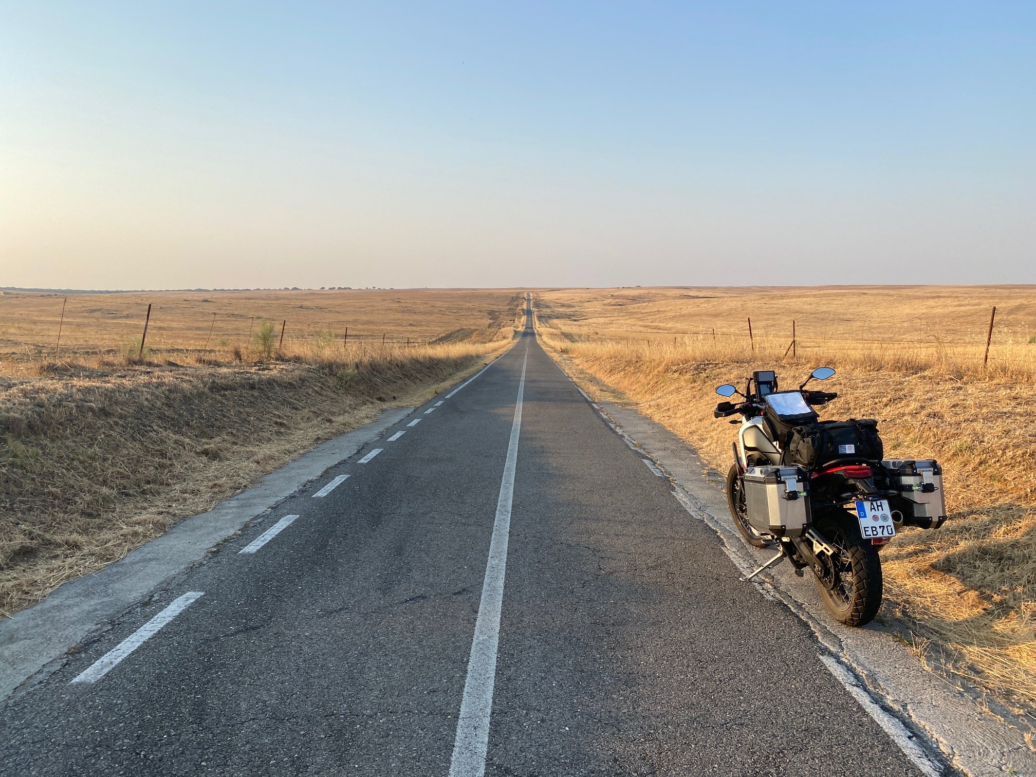 Gute 2h (mit Tanken) bin ich nach dem Frühstück nach Norden geschwommen, es schüttete wie aus Kübeln, bis ich den kleinen Weg nach links abgebogen bin. Nun ging es bergauf und kurze Zeit später wechselte der Regen nahtlos in so eine Art schweren, nassen Nebel. Sicht nahe Null. Es reichte mir und ein Kaffee wäre auch nicht schlecht....also einen Schotterweg rechts genutz und angehalten. Helm ab, Kaffee raus, Zigarette an....absolute Stille, bis auf den knirschenden Schotter unter den Stieleln und eine Sichtweite von max. 5m. Der Dunst prickelt förmlich auf der Haut und zog wie Milchsuppe am Scheinwerfer vorbei, gefühlt war ich im Zentrum der Kondensation....