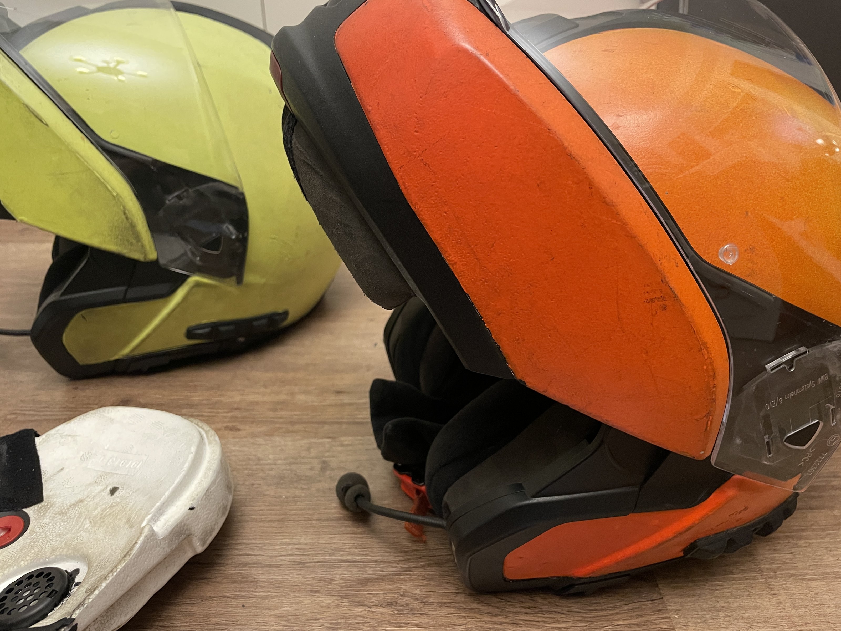 Unsere alten Helme (BMW System 6evo) sind reif für die Tonne.