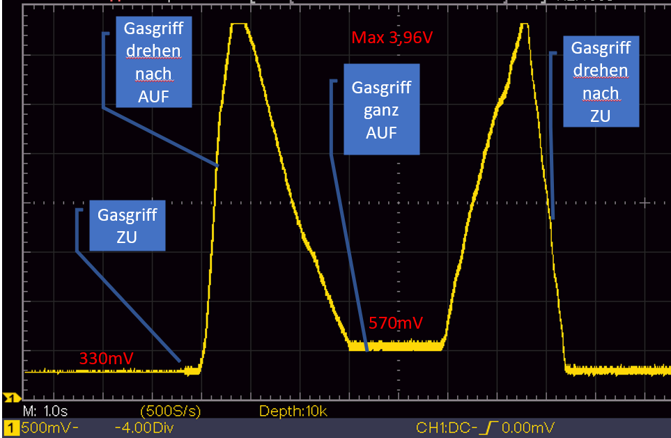 Anschlagschrauben DK links mit Messschieber messen, ganz rausdrehen, Poti auf 0-0,3V drehen, Poti festziehen, und dann Anschlagschrauben wieder auf den ursprünglichen Wert (Messschieber) setzen?