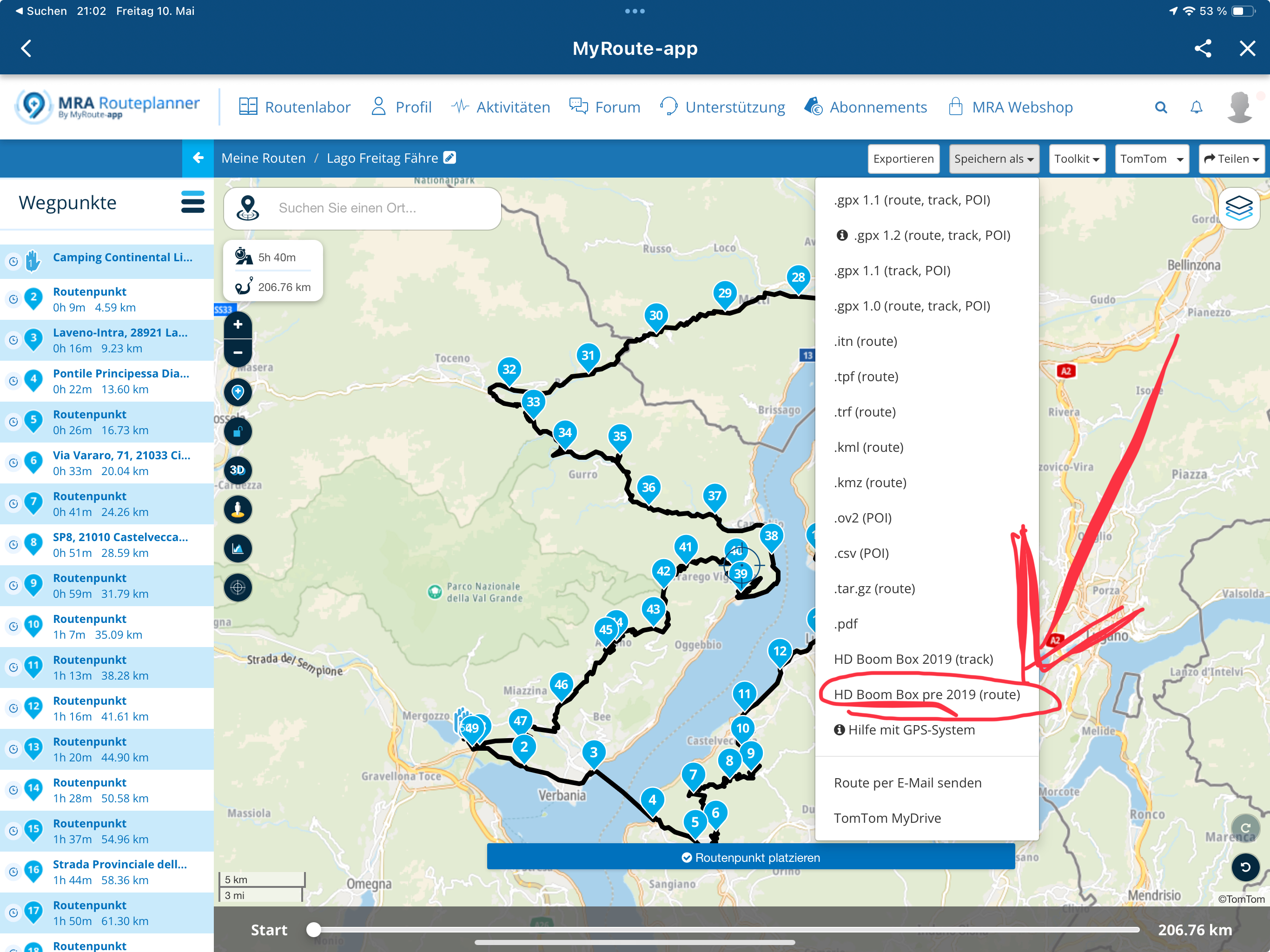Nach dem Export und Import zu CRN habe ich ebenfalls die Auswahl die Tour als Route mit WPs oder als Track (mit nur 7 SPs analog den WPs oder etwas "aufgefüllt mit 905 ps) mit Stützpunkten abzufahren.