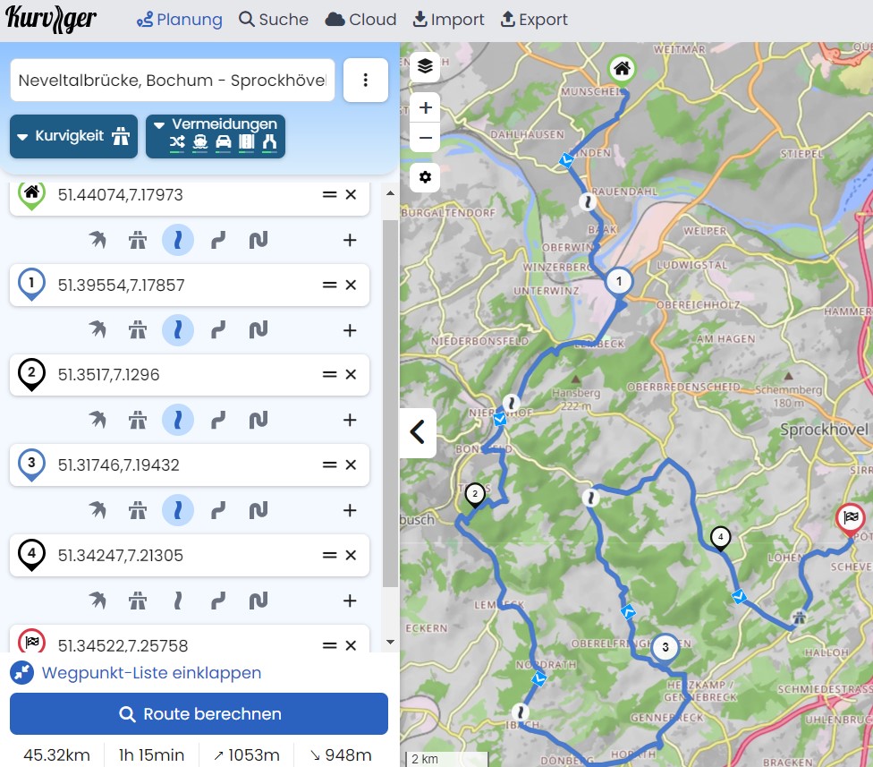 Schaul mal.. das meine ich. Im Kurviger Screenshot siehst du wie ich testweise geplant habt. Im Wechsel fixe WPs mit SPs.