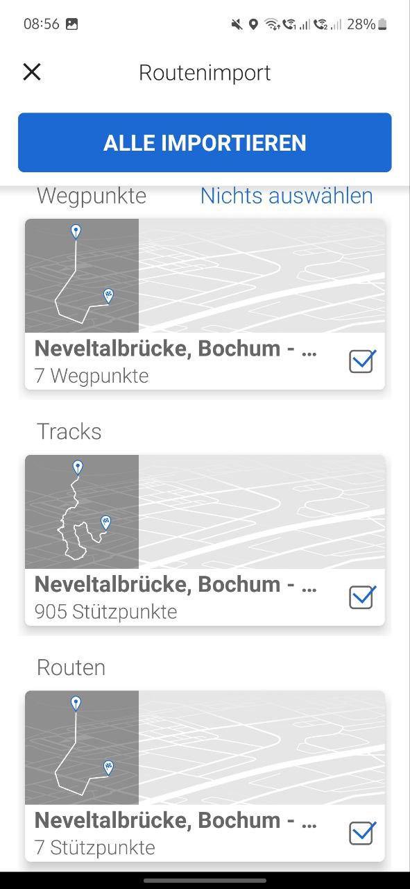 … ein Mix (Via und Shaping Points) geht definitiv, wegen der miserablen Importfunktion, schon nicht! Alles mit kleiner 51 Wegpunkten wird mit Via Points importiert und alles andere mit Shaping Points. Da Tracks meistens sehr viele Wegpunkte haben, wirst du nur Tracks mit Shaping Points sehen. Importierst du von BaseCamp, dann hat auch die Route auch meistens nur Shaping Points (wegen der Garmin Extensions und der da gespeicherten Wegpunkte).