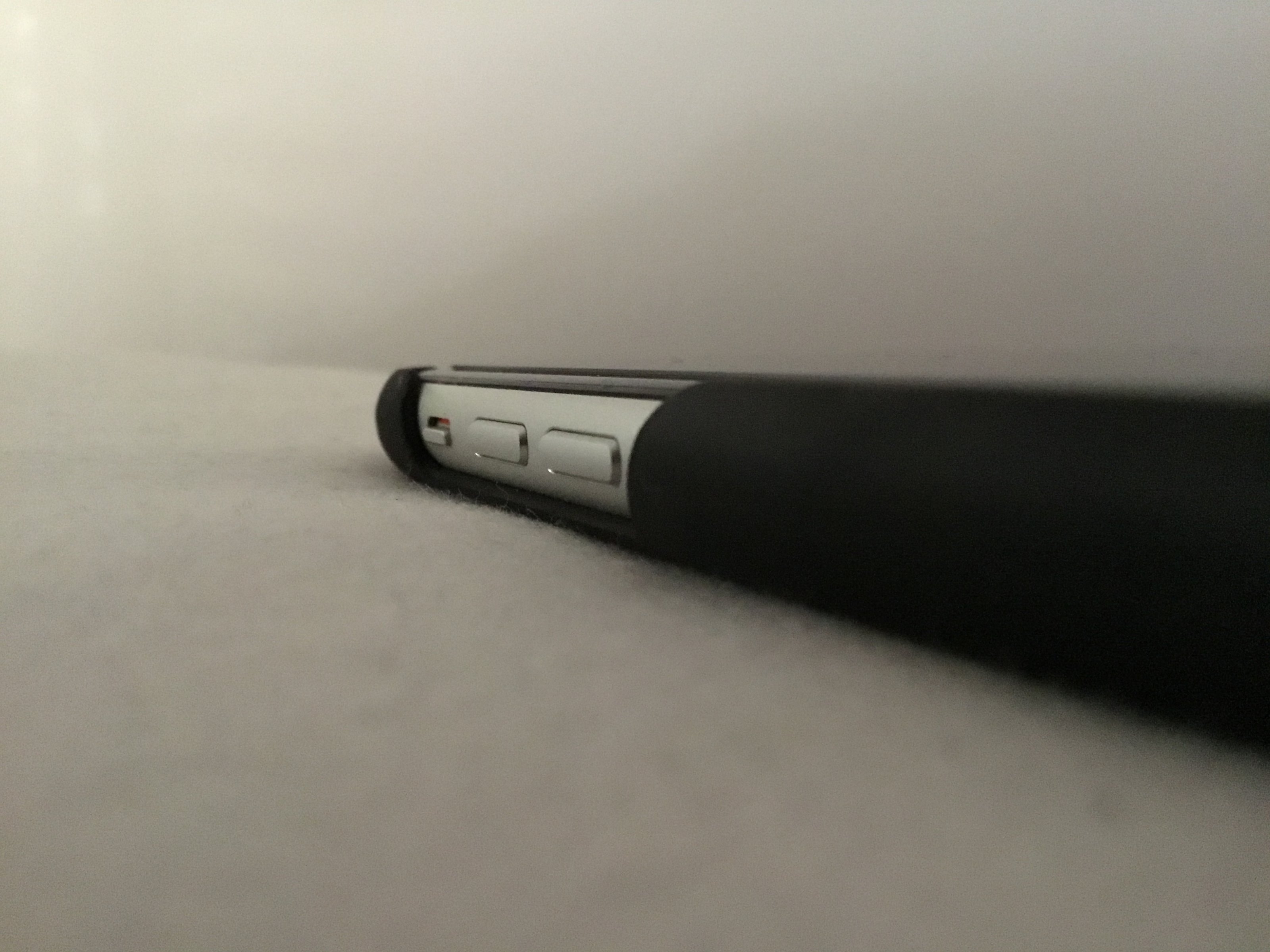 - links einen Anschlag einkleben, damit das IPhone weiter nach rechts rückt und die Kralle neben der Taste auf das Gehäuse drückt - sieht bescheiden aus