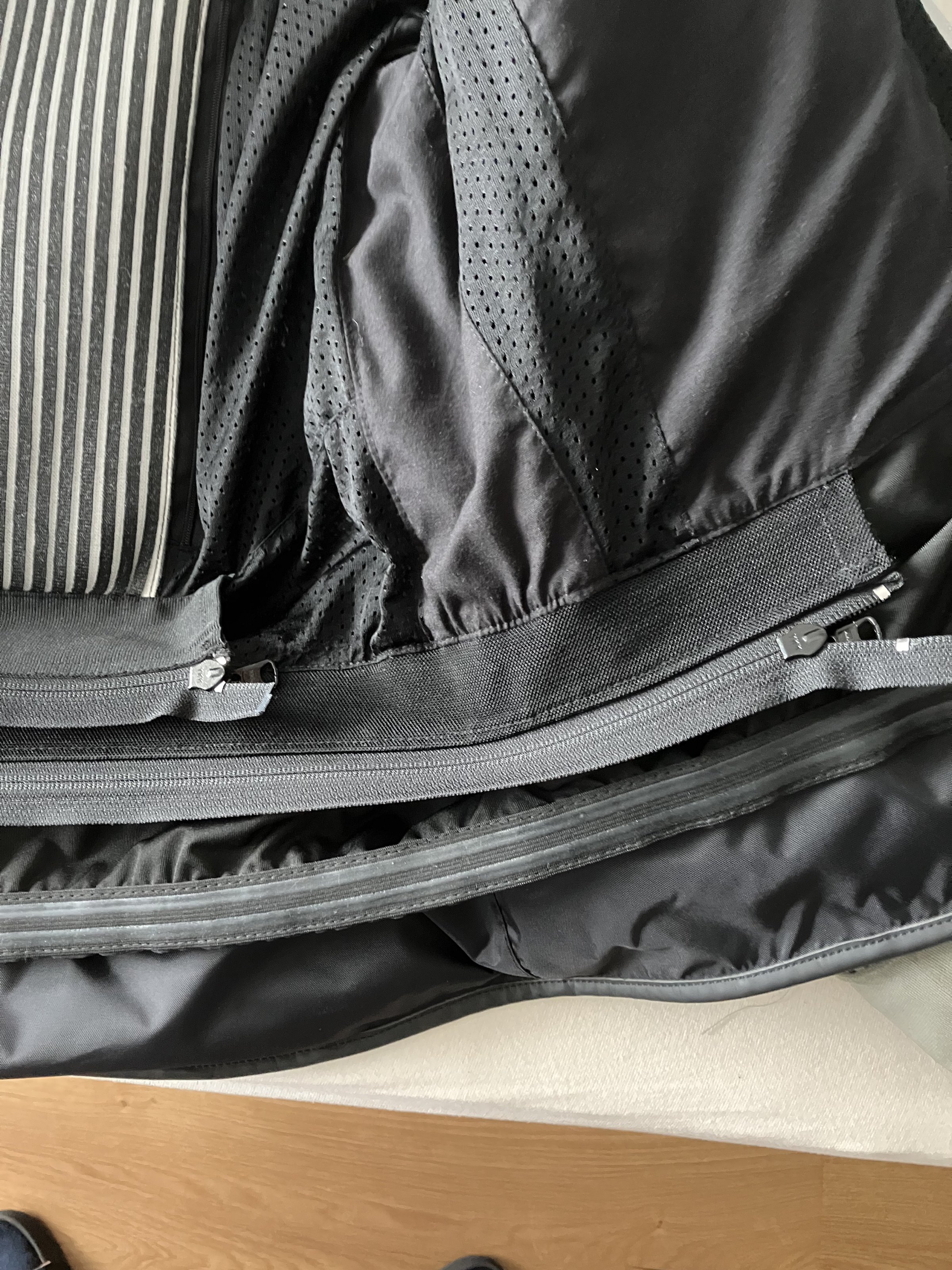 Die Reißverschlüsse sind tadellos, keine auffallenden Flecken, voll funktionsfähig. Die Jacke verfügt hinten, innen, über