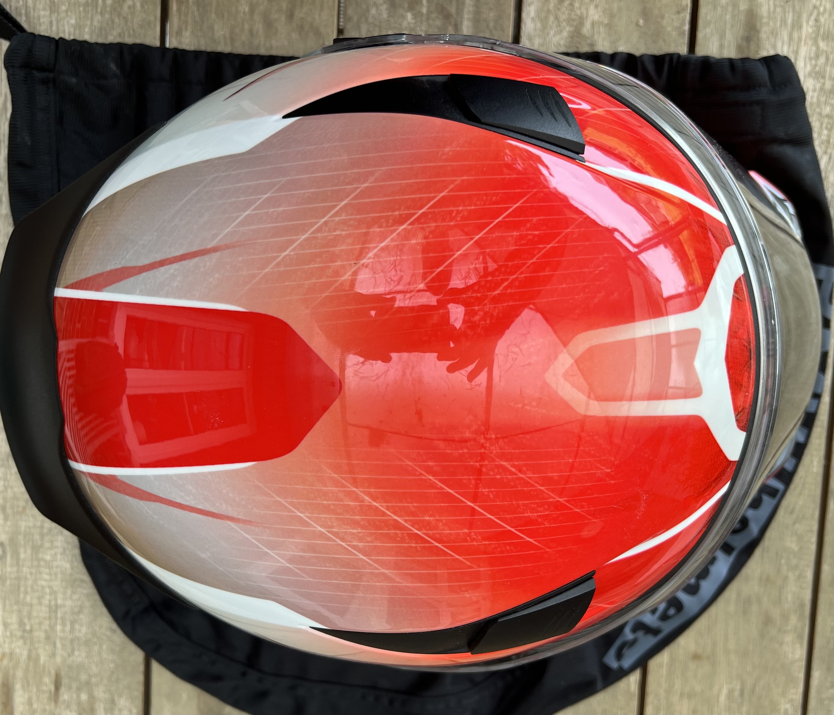 Der Integralhelm ist für die Rennstrecke geeignet, im Windkanal auf über V-max 300km/h getestet, sehr leicht (Carbon), sitzt wie eine 2. Haut.