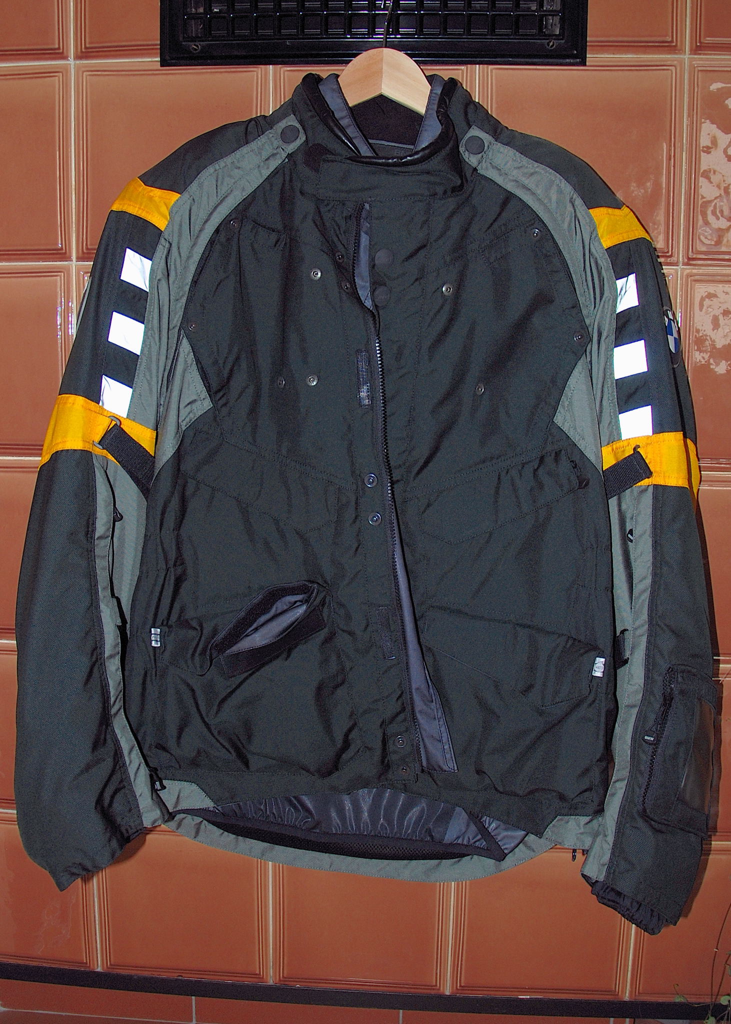 Die Farbe heißt meines Wissens schwarz-gun - es ist auf jeden Fall die schwarz-grau-gelbe Farbkombination. Die Jacke befindet sich in einem sehr guten Zustand und weist, wenn überhaupt, nur minimale Gebrauchsspuren auf. Die Größe 56 fällt etwas kleiner aus und entspricht eher einer 54er bzw. XL.