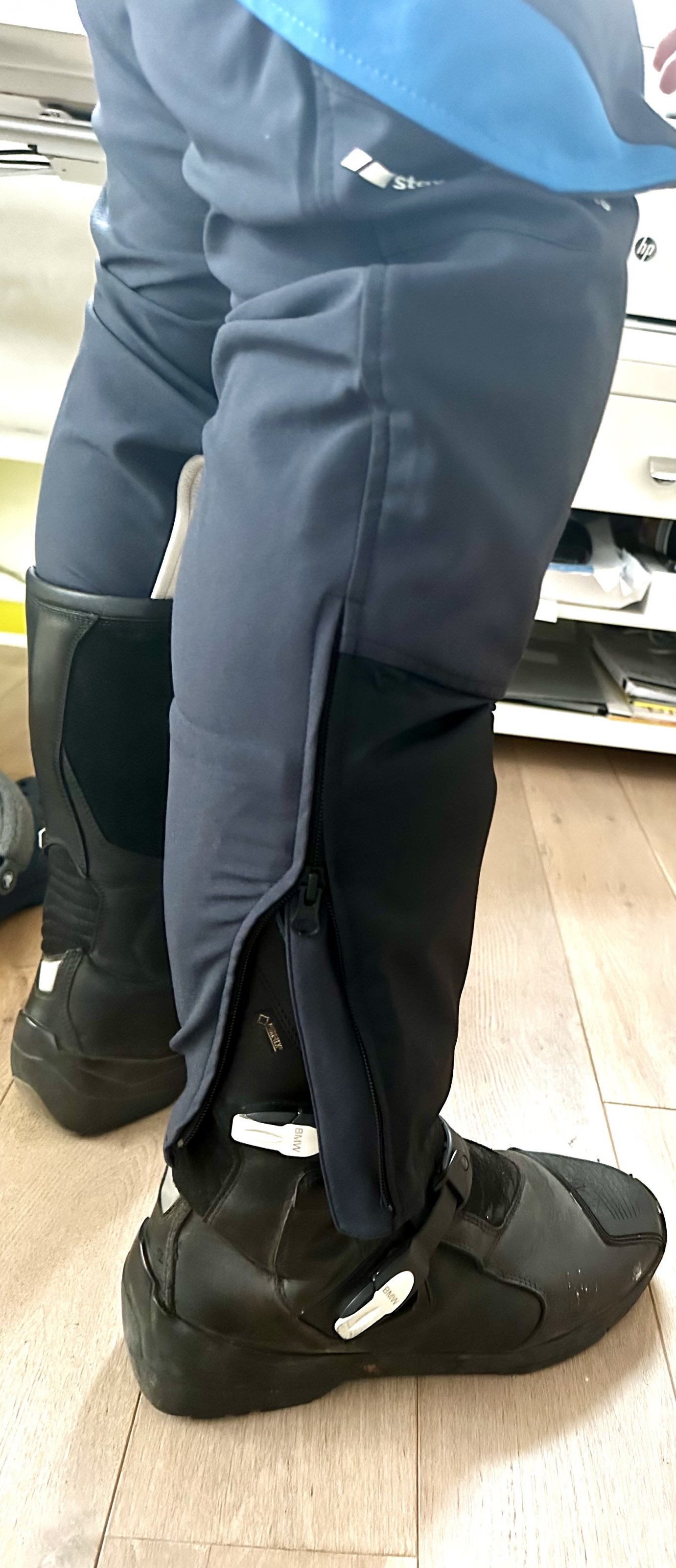 Da ich von der Optik abseits des Mopeds auch nicht angetan war, habe ich es gerade mal ausprobiert. Für den Fall passt die Hose über die Stiefel. In meinem Fall sind es die BMW Gravel Evo - super Stiefel, läuft sich auch sehr bequem.