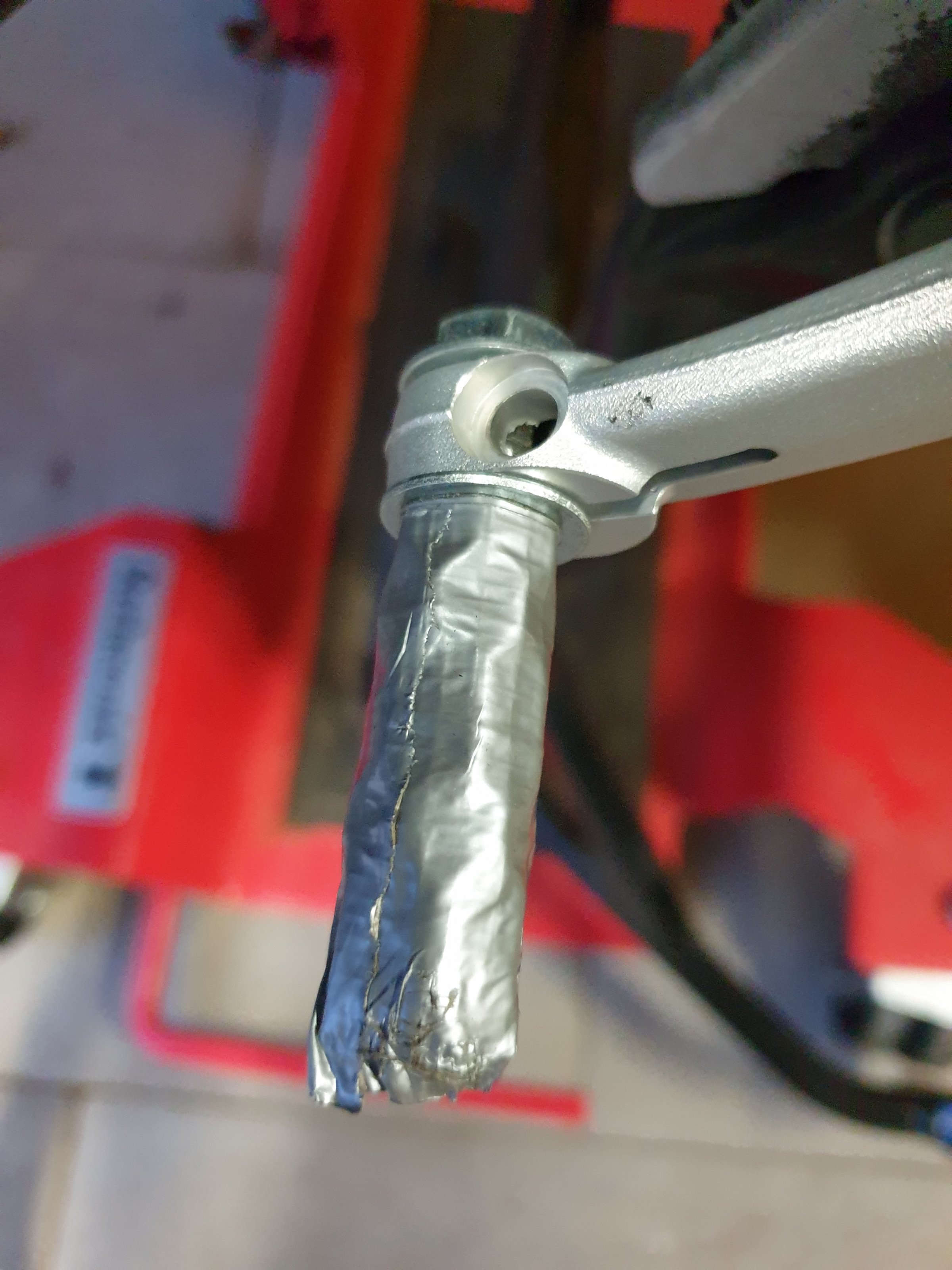 Improvisiert haben dann die wirklich freundlichen Monteure von BMW AHAG Witten in der Nähe, die eigentlich nur Autos im Repertoire haben. M8-Schraube, 2 U-Scheiben und ein paar Muttern. gepolster mit Panzerband.