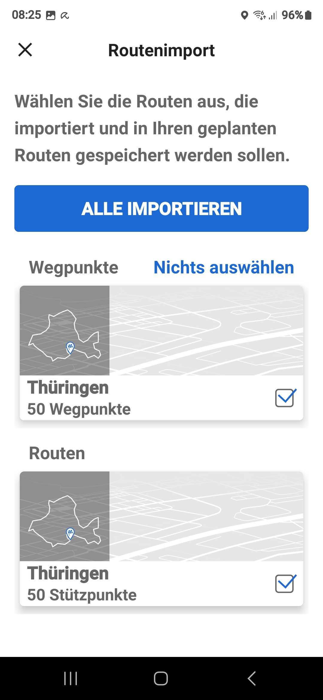 Hängt m.E. davon ab, mit welchem Programm die Routen erstellt werden und das verwendete Format. Ich nutze MRA und importiere entweder im gpx 1.1. oder HD Boom Box pre Format. So können entweder Stützpunkte, welche in Wegpunkte umzuwandeln sind oder direkt Wegpunkte (jeweils max. 50) in die App übernommen werden.