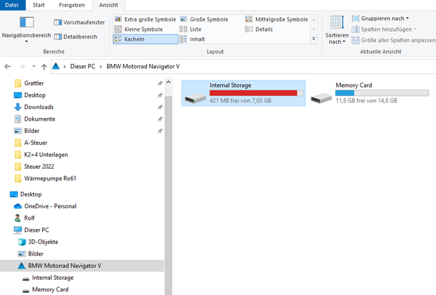 wenn ich mein Navi V angeschlossen habe zeigt mein PC im Explorer Internal Storage „421 MB frei von 7,03 GB“. Wenn ich Internal Storage anklicke und mir unter Eigenschaften die jeweiligen Dateigrössen anschaue, komme ich auf ca 300MB. Warum sehe ich nicht die restl 6,7GB ? Kann man das bereinigen ? Wie?