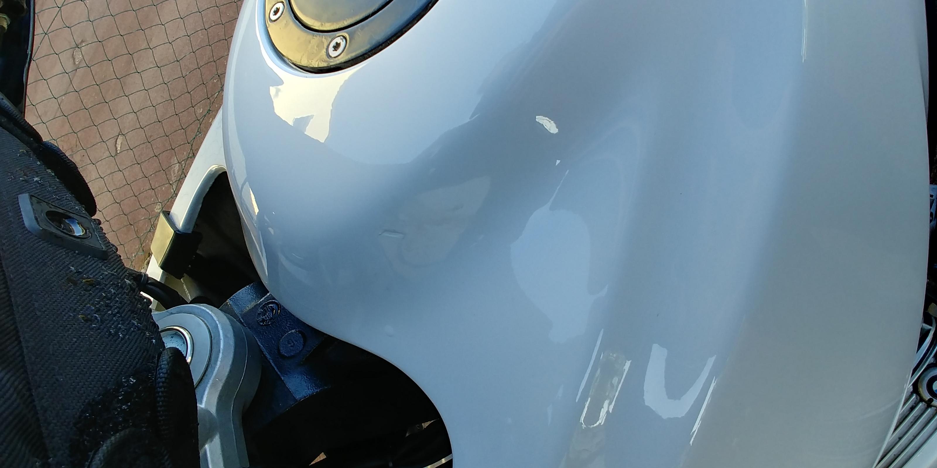 2017 wurde die GS komplett neu in Alpinweiß lackiert. Dabei wurde ebenfalls eine kleine Delle im Tank ausgebessert. Wie es das Karma so will habe ich mir gleich beim Aufsetzen des neu lackierten Tanks eine Macke in diesen gehauen. Mit der neuen Lackierung wurden der Gepäckträger sowie der Tankdeckel mit Sprühfolie schwarz foliert. Diese löst sich am Gepäckträger mittlerweile wieder. Wen es stört, der kann die ganze Folie wieder abziehen und dann sind die Teile wieder original Silber.