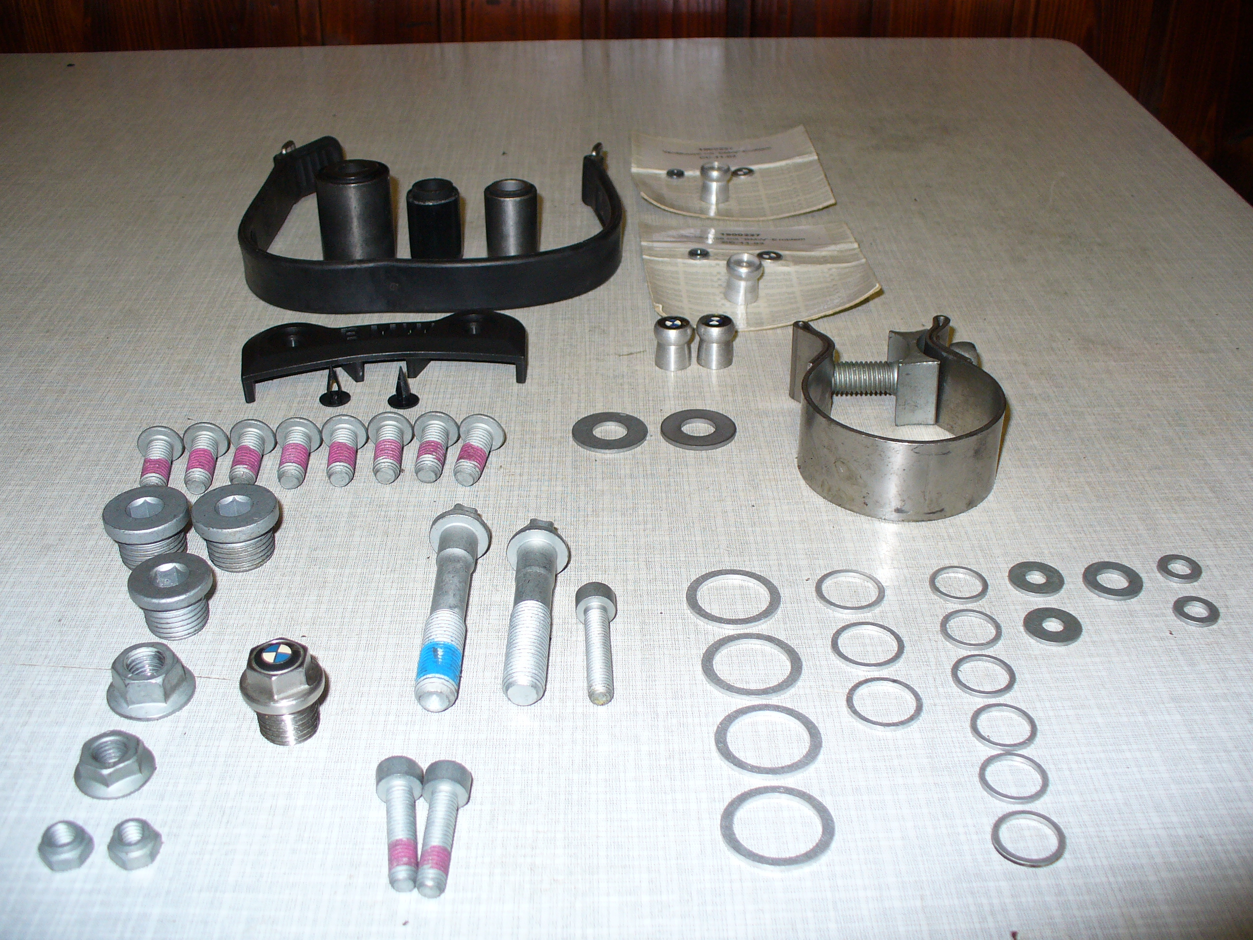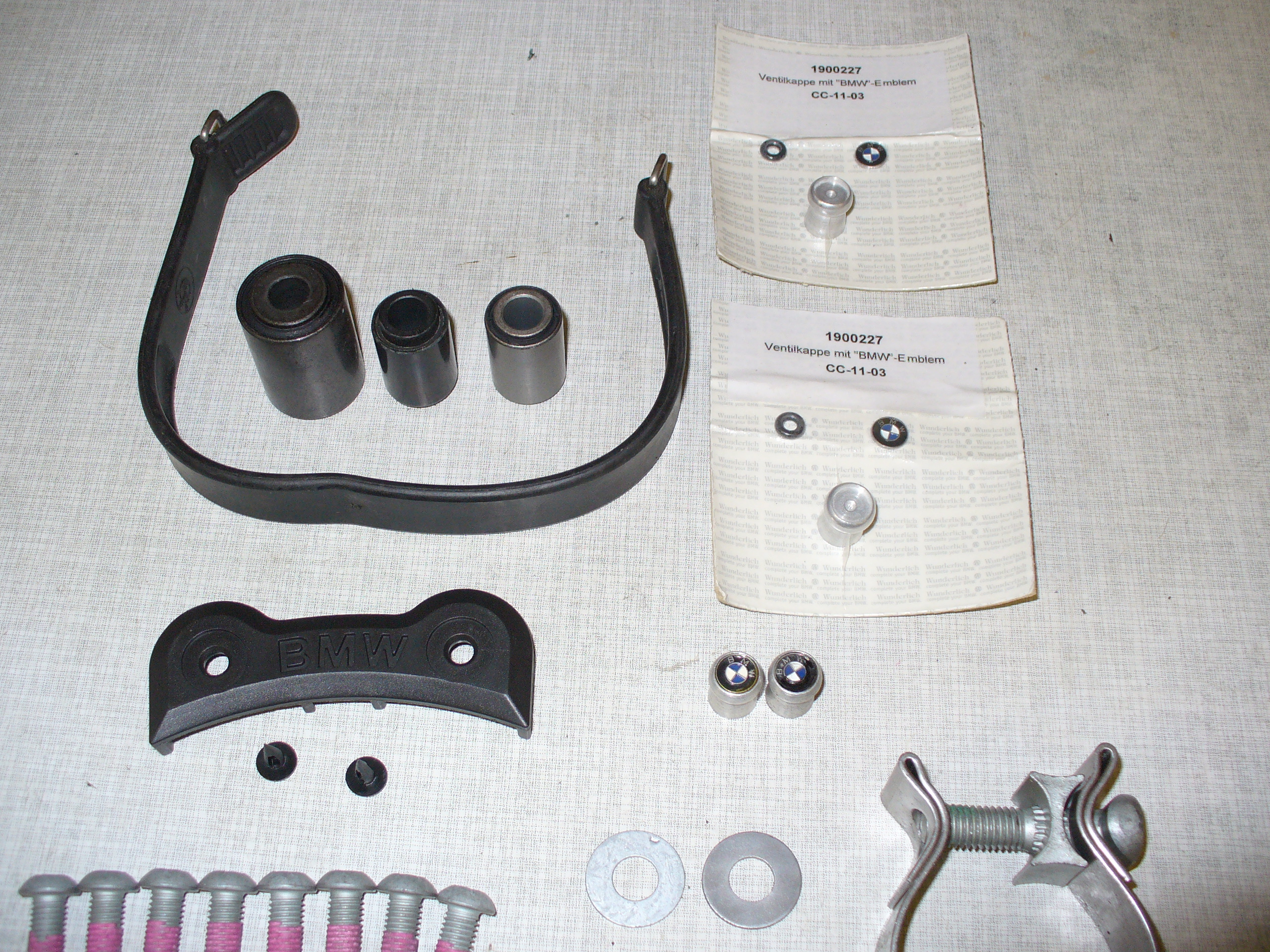 Es sind Schrauben für die Fuß-Bremszylinder Befestigung, Dichtungen, Einfüllschraube für das Hinterachsgetriebe mit BMW Emblem! sieht super edel aus. Ventilkappen von Wunderlich mit BMW Emblem, bis auf ein zwei Teile alles neu.