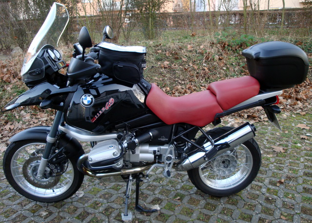 Touratech Tankrucksack und Seitenständer-Auflagevergrößerung, BMW-Ventilkappen, Ölkühlergitter-Schutz,