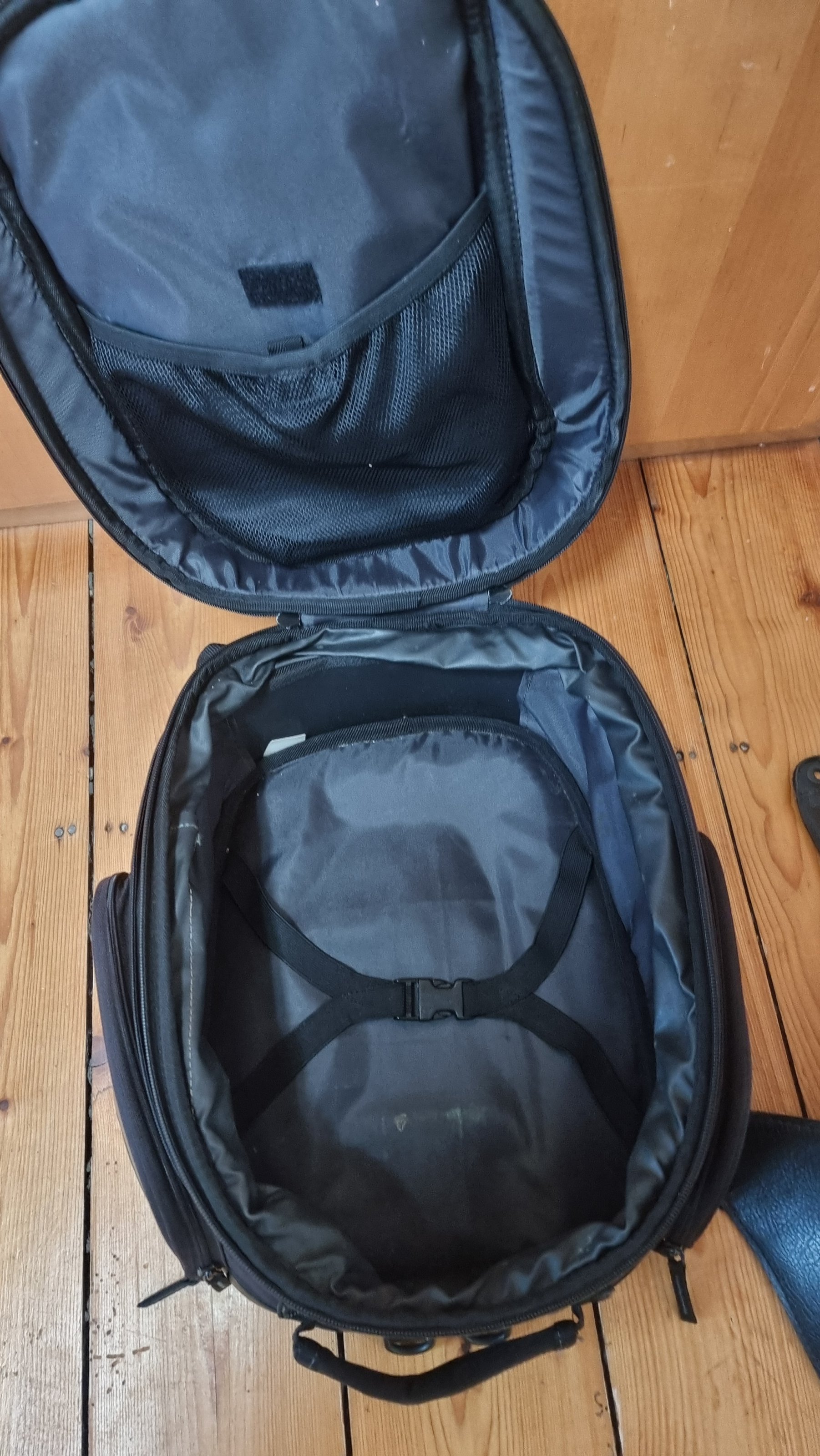 Der Tankrucksack ist mittels umliegenden Reissverschluss erweiterbar. Dabei sind auch Gurte um die Tankrucksack als Rucksack tragen zu können. Der Tankrucksack hat an den Seiten Taschen für Kleinteile.