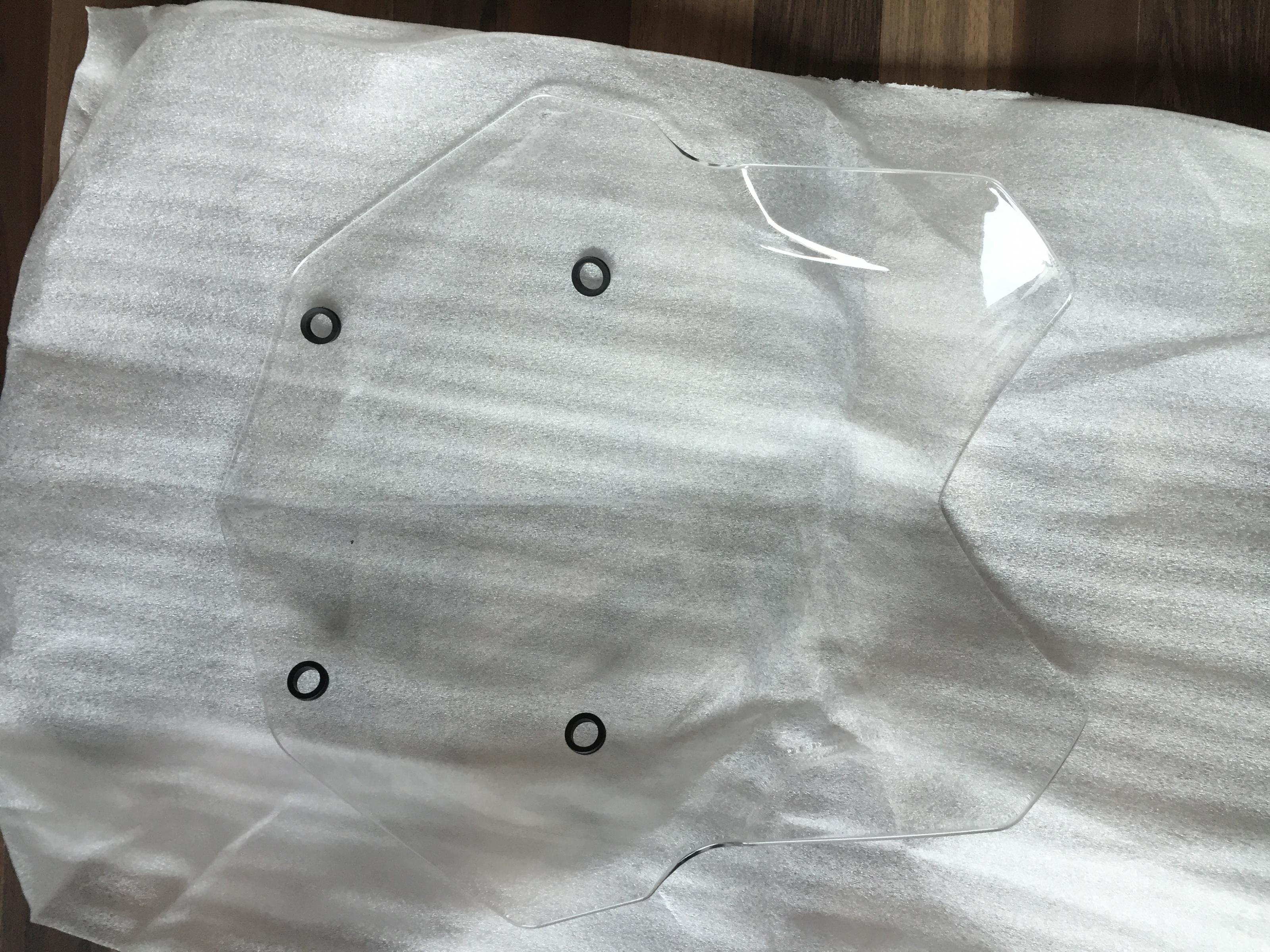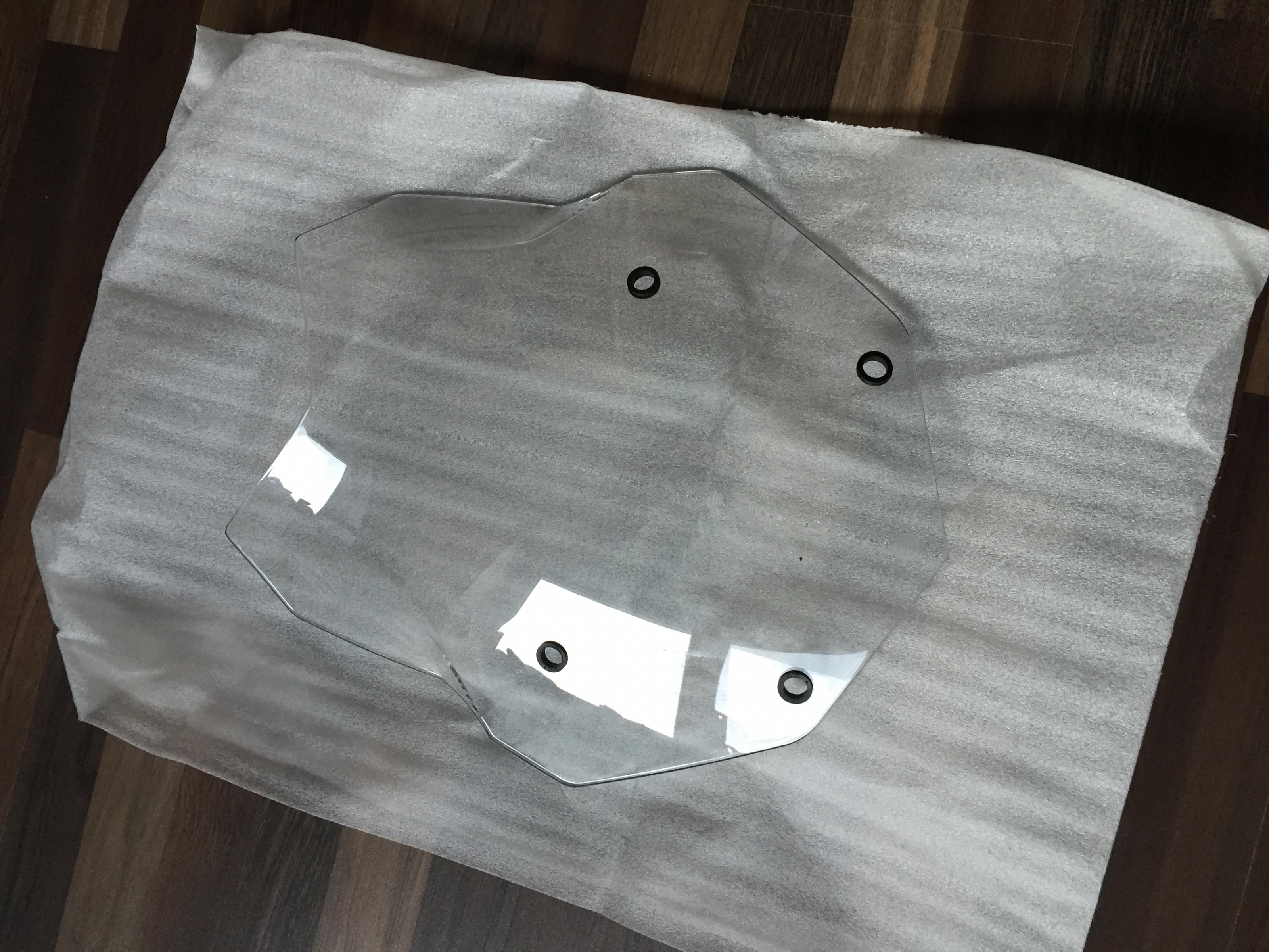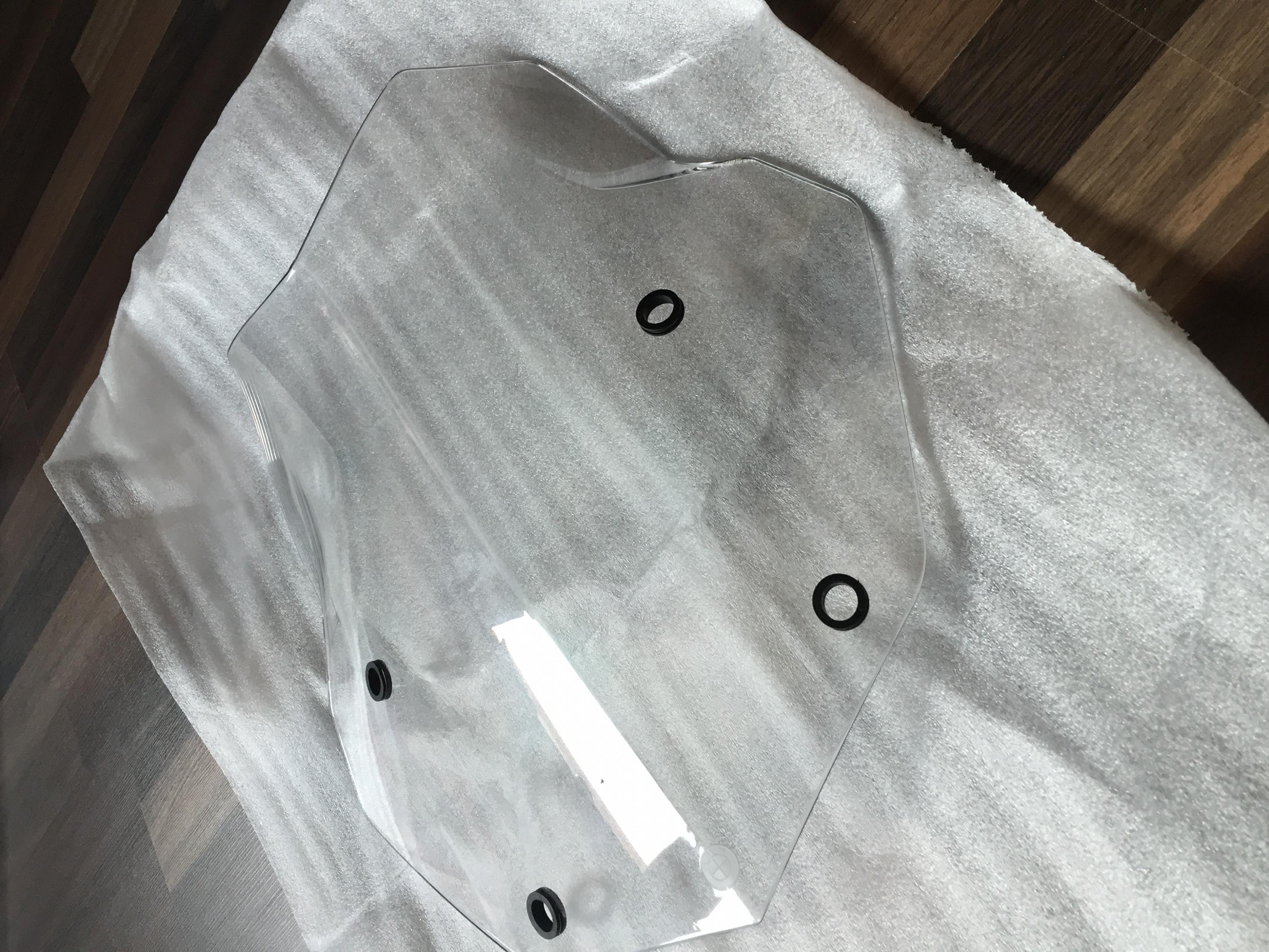 Verkaufe mein Windschild welches nur vom Händler bis nach Hause montiert war. Habe es direkt danach gegen die schwarze Scheibe getauscht. Es wurde direkt in die Verpackung der dunklen Scheibe eingewickelt.