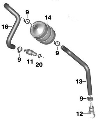 Die gebrauchte, in gutem Zustand befindliche Kraftstoffpumpeneinheit einer BMW R1200R (DOHC) aus dem Jahre 2011 (ohne Pumpenelektronik) einschließlich des externen Kraftstoffilters inkl. der beiden, zugehörigen Formschlauchleitungen und allen damit verbundenen und original auch so montierten Schnellkupplungsteilen.