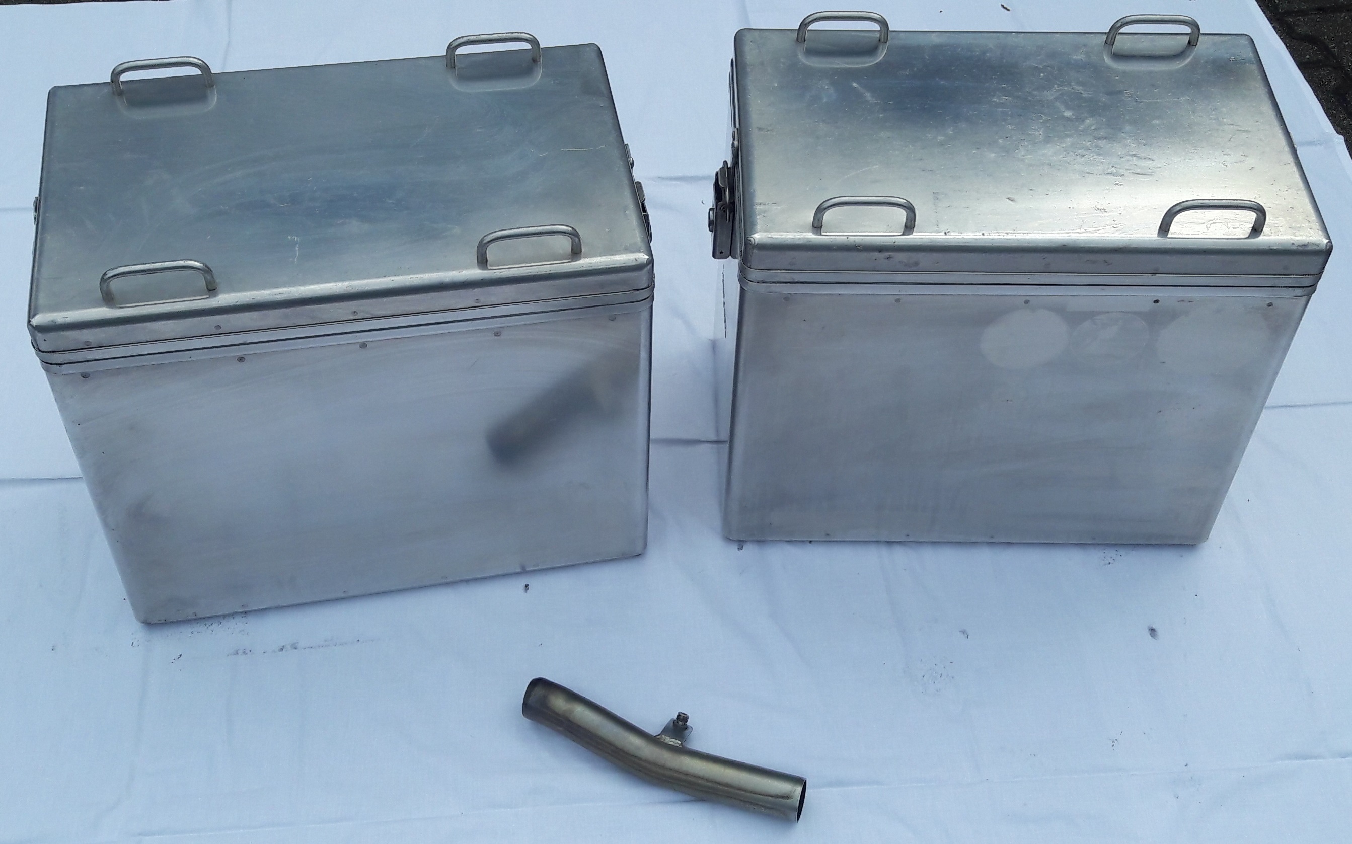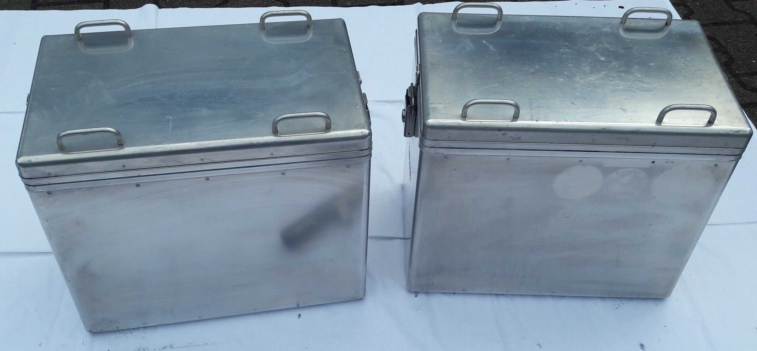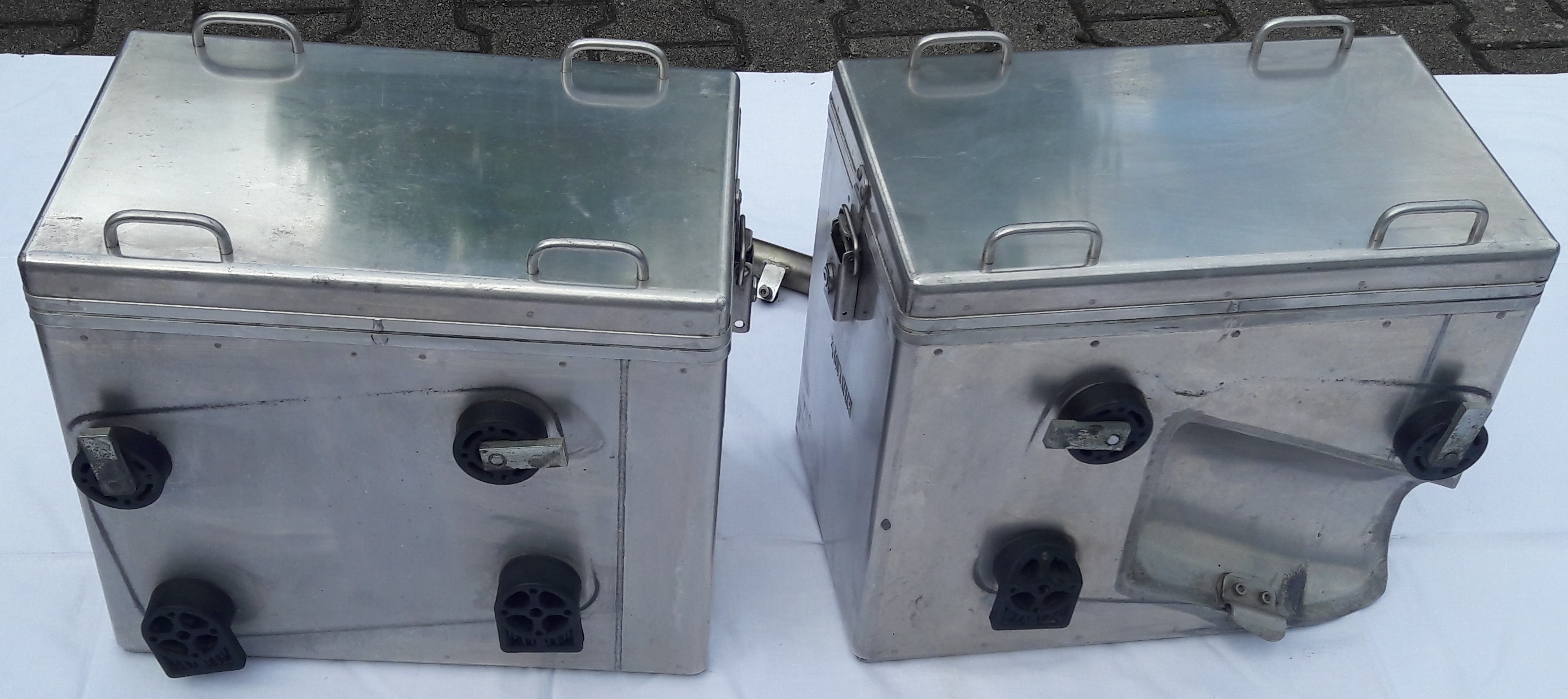Verkaufe einen kompletten Satz Zega Alukoffer inklusive Schlösser mit zwei Schlüsseln sowie die passenden Kofferhalter inklusive Schrauben. Es handelt sich um das Sondersystem mit zwei 41 Liter Koffern bei dem die linke Seite eine Aussparung für den Auspuff hat. Die Bauteile sind in einem guten Zustand, das heißt nichts ist verbogen oder korrodiert. Es sind natürlich durch Zeit sichtbare Gebrauchsspuren vorhanden aber keine tiefen Kratzer und es sind weder Koffer noch Halter verzogen.