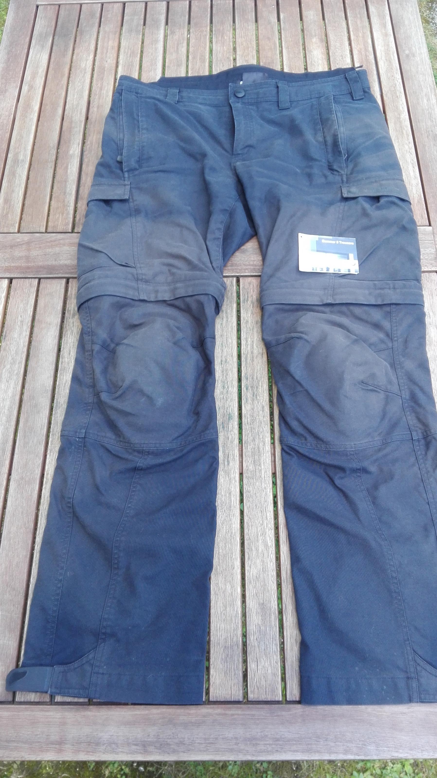 Farblich ist die Hose durch die Sonne besonders an den Oberschenkeln ausgeblichen. Sie ist nicht mehr tiefschwarz, sondern eher anthrazit. An Stellen, wo die Sonne nicht hinkommmt, ist sie noch schwarz. Dies würde ich aber nicht als Mangel beschreiben, sondern als normale Gebrauchsspuren, ähnlich wie man sie nach einiger Zeit auch von einer Jeans kennt.