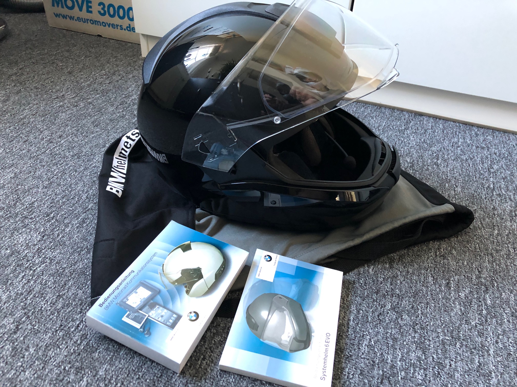 Verkaufe einen BMW Systemhelm 6 Evo in glanz-schwarz inkl. des Original BMW-Kommunikationssystems (Helmsack, Ladegerät und Anleitungen liegen bei), Gr. 56/57, wurde von Sozia lediglich für 2 Touren mit Sturmhaube getragen, wahrscheinlich ein Helm dieses Modells aus allerletzter Produktion, Rechnung aus 07/2019 liegt vor, minimale Gebrauchsspuren, liegt seit Ende 2019 im Schrank, Akku wurde regelmäßig geladen, Euro 299,-