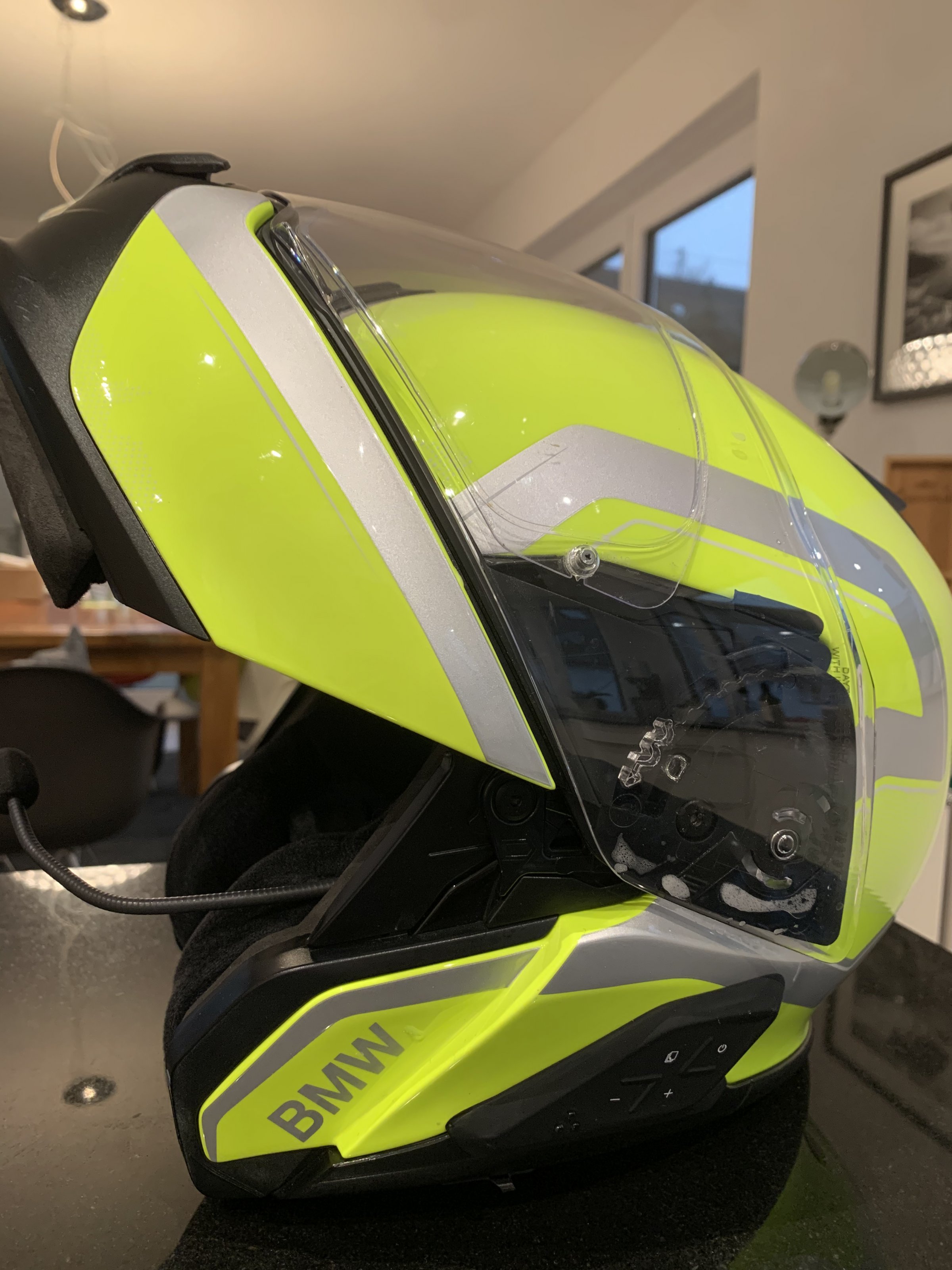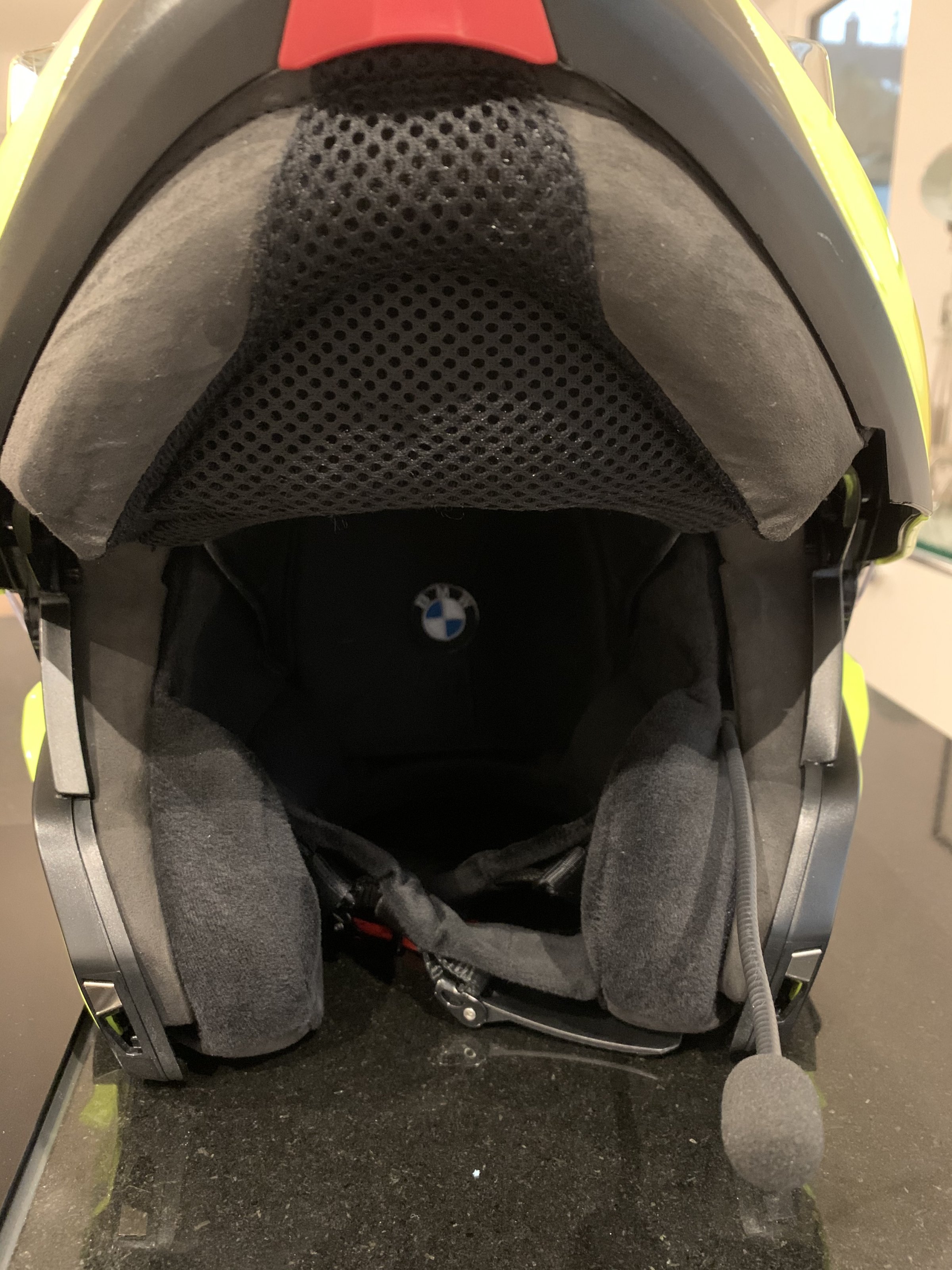 Ich biete einen neongelben Helm BMW System Carbon 7 der Größe 60/61 mit eingebauter Kommanlage für die Koppelung mit Navigator 6 an einer GS