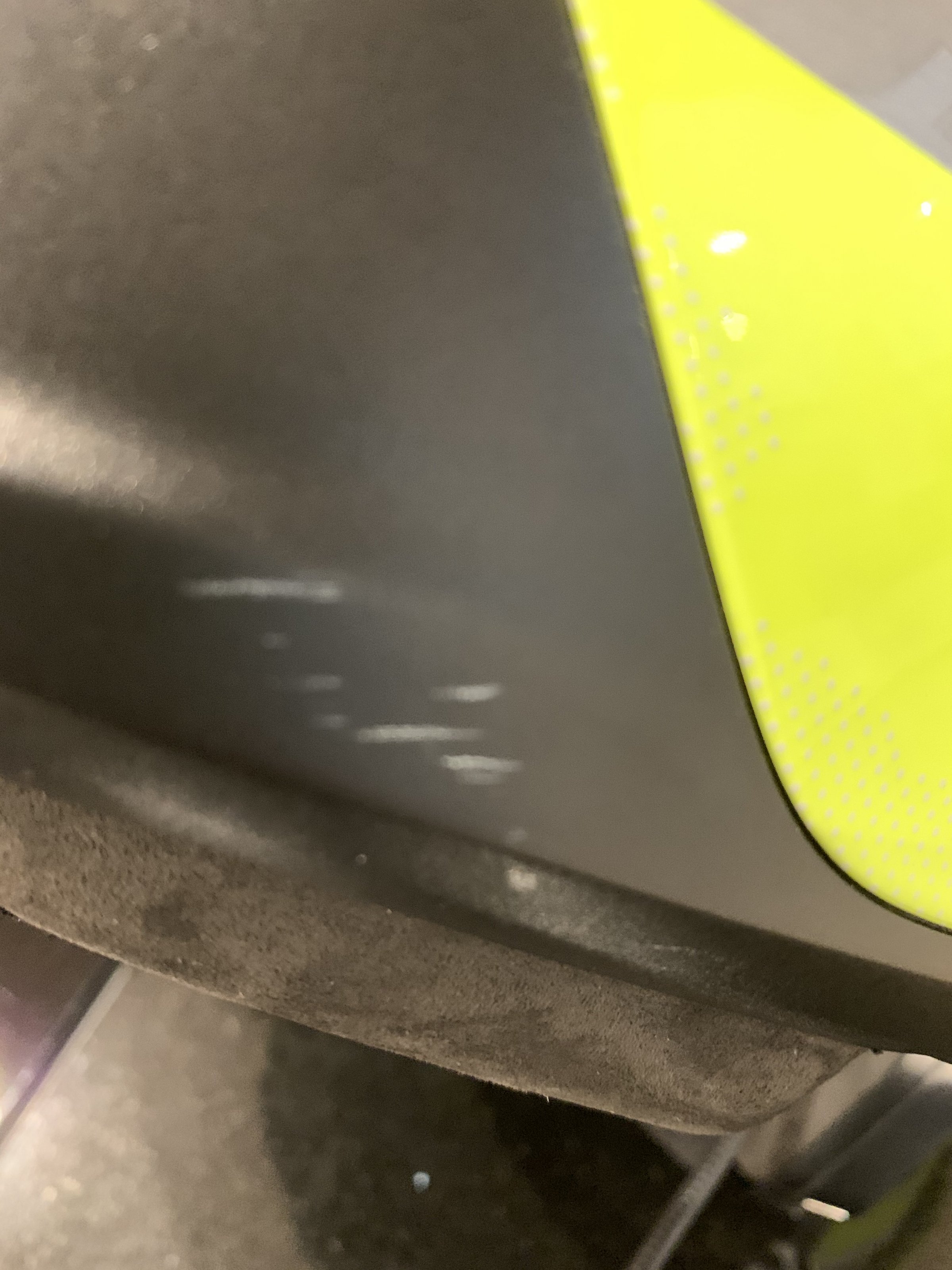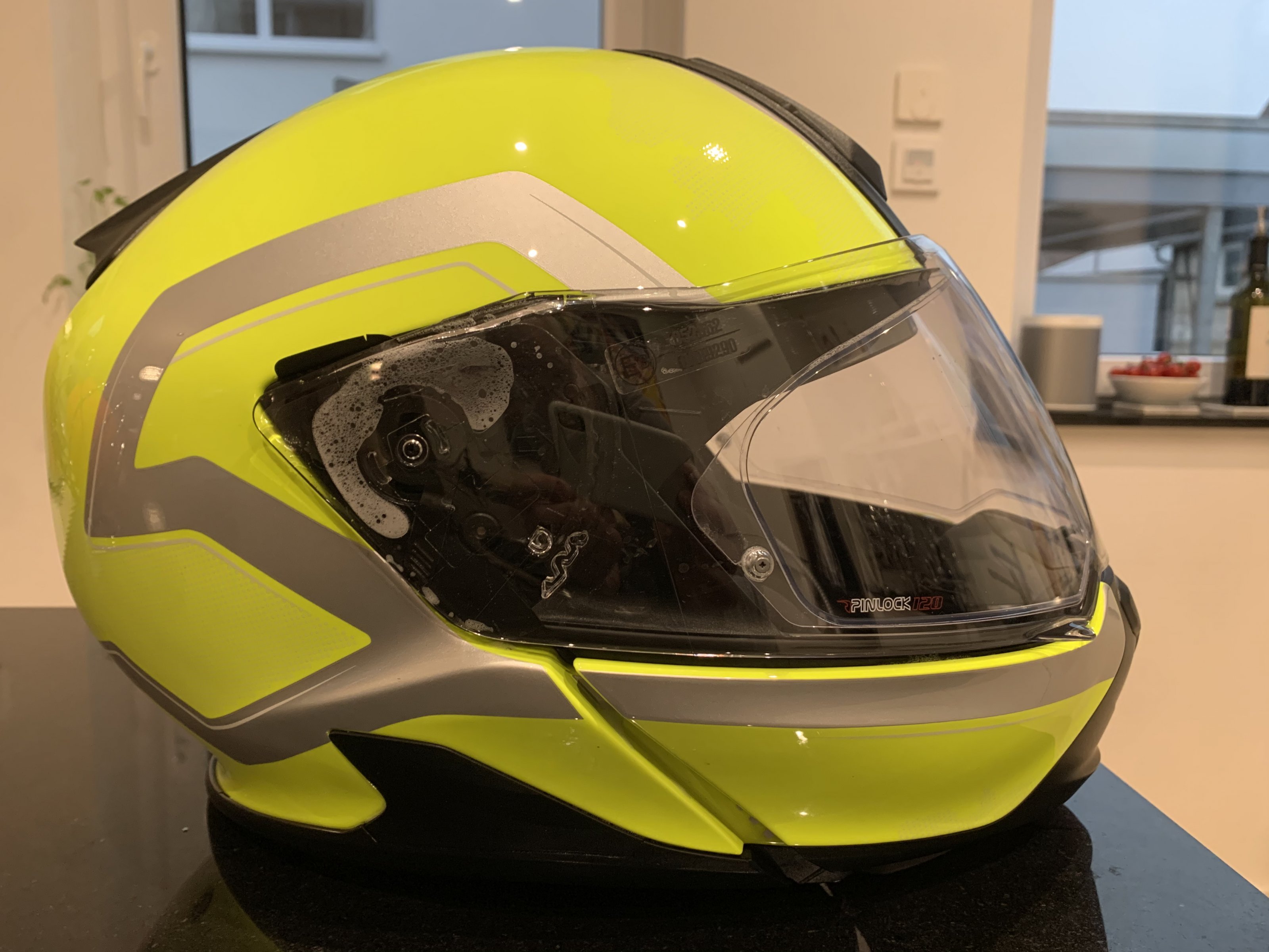 Der Helm ist ein Jahr alt, kaum getragen und wenn dann immer mit Sturmhaube. Er hat minimale Streifen aber die sind nicht im Material und beeinflussen keinesfalls die Funktion. Einen Helmbeutel kommt dazu.