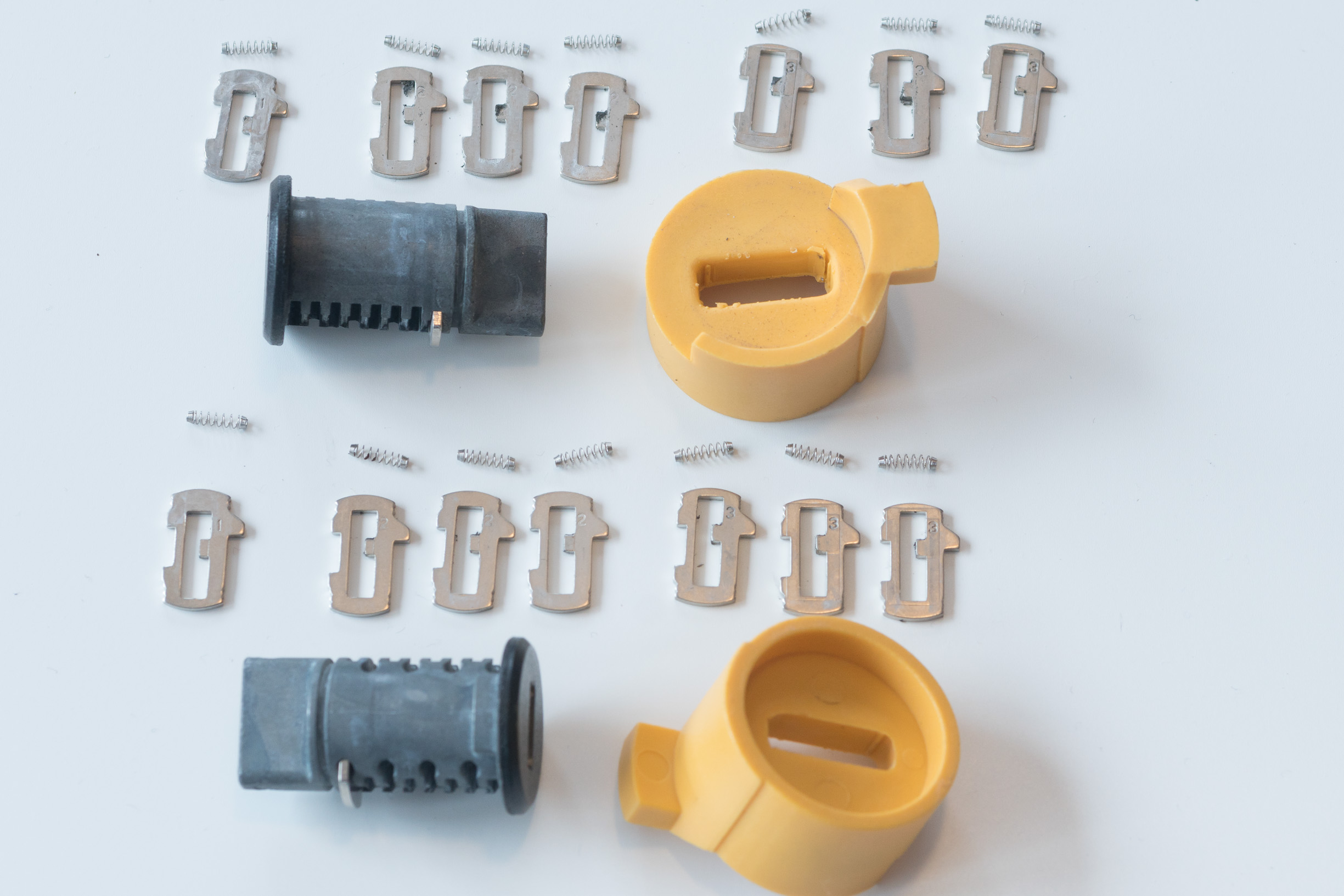 Incl. 2 Schließzylinder ohne Schlüssel und mit den abgebildeten Codierplättchen. Leider habe ich die überzähligen Plättchen vor 2 Jahren so gut verstaut, dass ich sie nicht mehr finden kann. Falls die noch auftauchen sollten gebe ich die natürlich noch mit. Zusätzliche Plättchen sollte es beim BMW Dealer gegen Spende in die Kaffekasse geben. Auch mit den vorhandenen Plättchen ist die Codierung auf den Fahrzeugschlüssel und Schließfunktion möglich. Je nach Schlüssel kann es aber vorkommen, dass einzelne Schächte freibleiben.