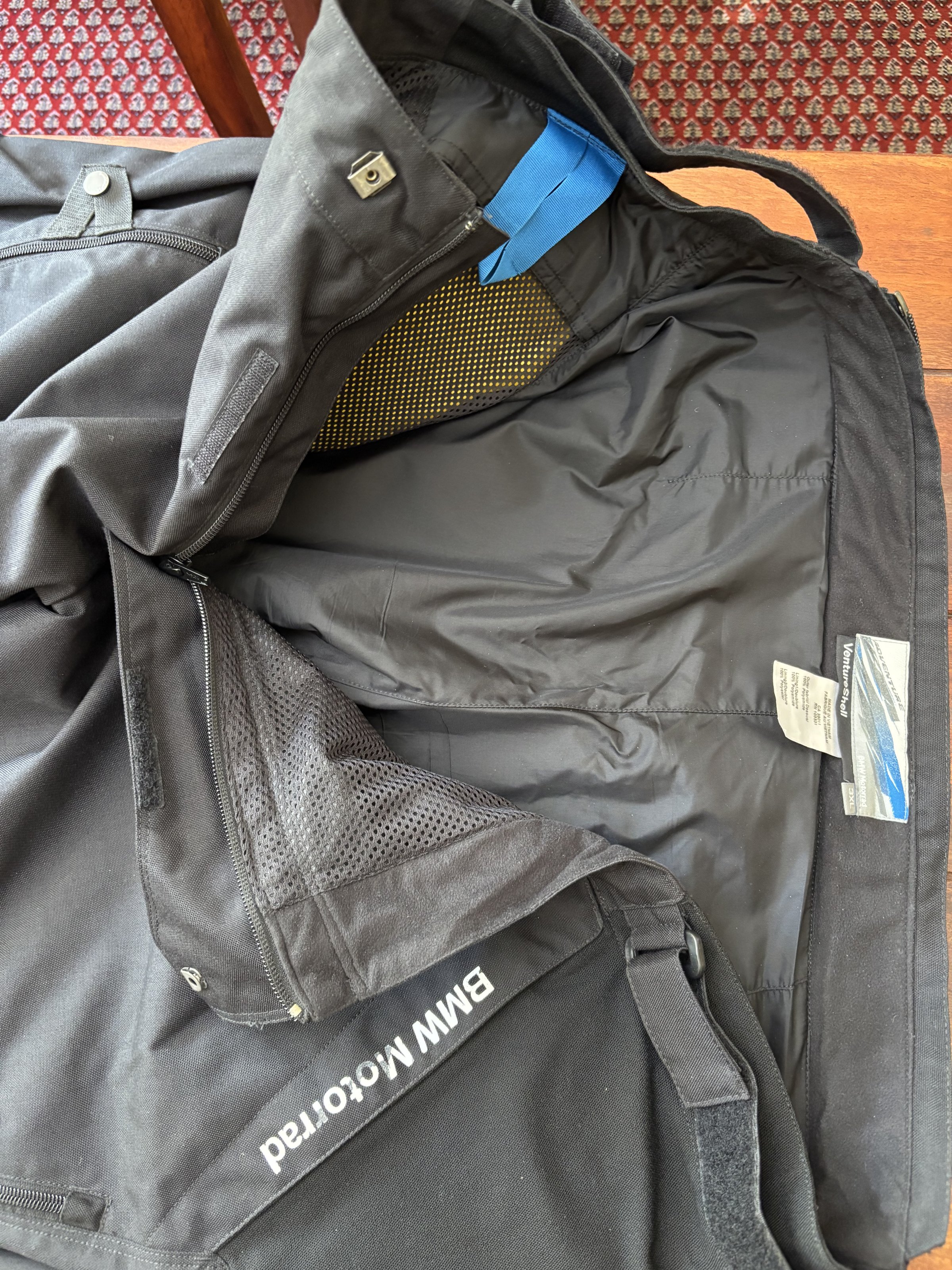 1) 1x BMW Venture Shell, 3XL, gebraucht, Neuwertiger Zustand, keine Risse, Abschürfungen oder Abrieb (siehe Fotos). Lediglich die BMW Schrift über der linken Tasche ist beim Waschen etwas lädiert worden. Hosen sind mit NIKKWAX Spezialwaschmittel gewaschen und dann mit dem adzu passenden Imrägnierer wieder imprägniert worden. Bundweite und Länge siehe Bilder. Preisvorstellung 60 Euro.- plus Versandkosten