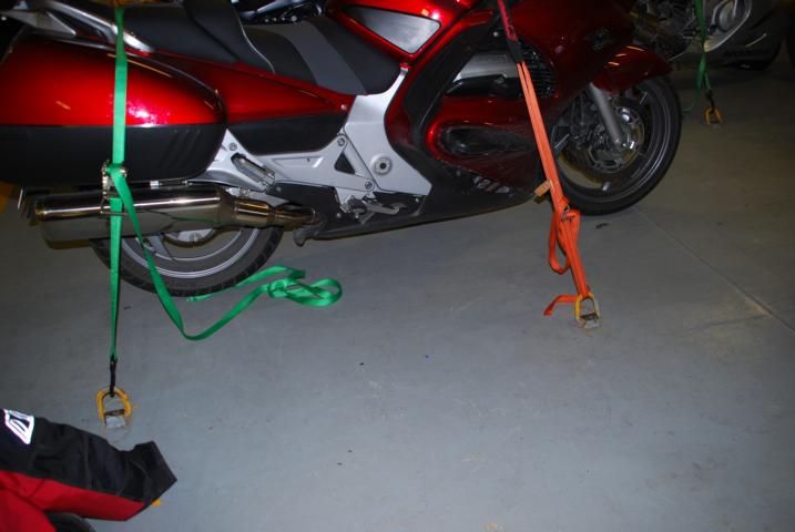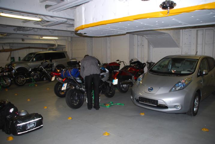Die Motorräder müssen selbst verzurrt werden, Gurte sind an Board.