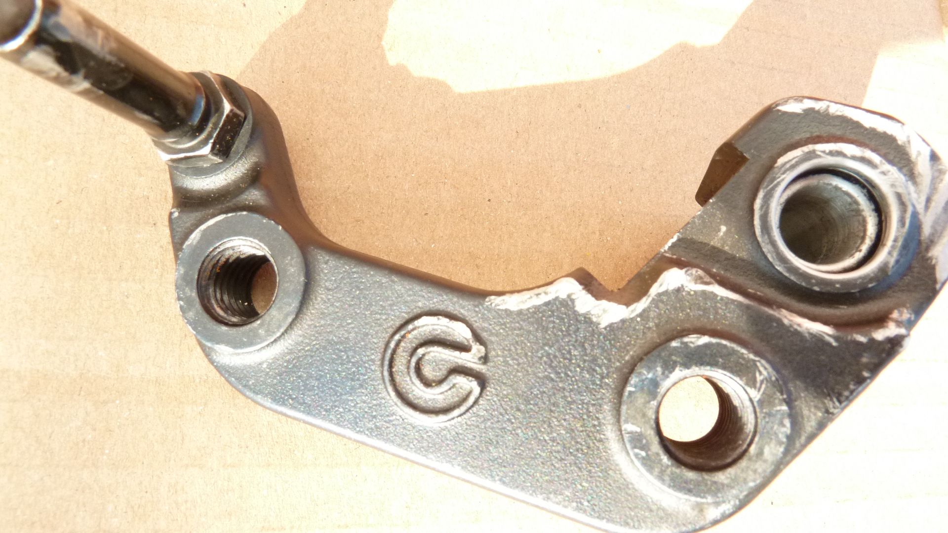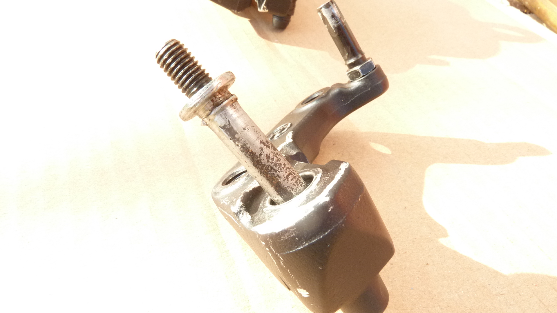 Während des KD rief mich der Service an und sagte, dass der Sattel wohl nicht reparierbar sei und weitere Arbeiten zu aufwendig seien. Er empfahl mir einen neuen einzubauen, was ich dann auch akzeptierte. Allerdings lies ich mir das Altteil geben, was ich zerlegte. Der lange Stift war vollkommen eingerostet und konnte nur durch grobe Gewalt mittels Kombizange und drehen bzw. Hammerschläge rausgeklopft werden.