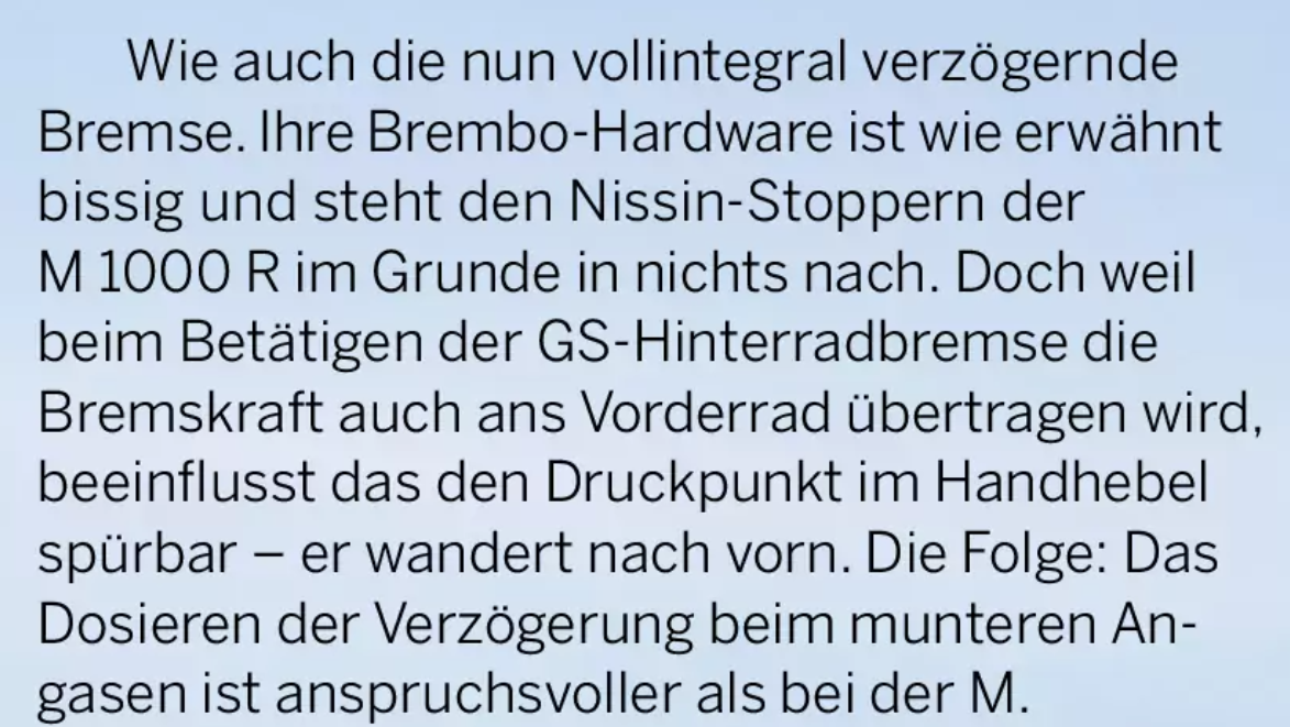 @Lunti (Norbert) wirklich Recht geben. Zumindest bei meiner und seiner GS ist die "Sportbremse" keine Sportbremse und keinesfalls mit der Anlage der M1000 R oder nur der S1000 XR vergleichbar.