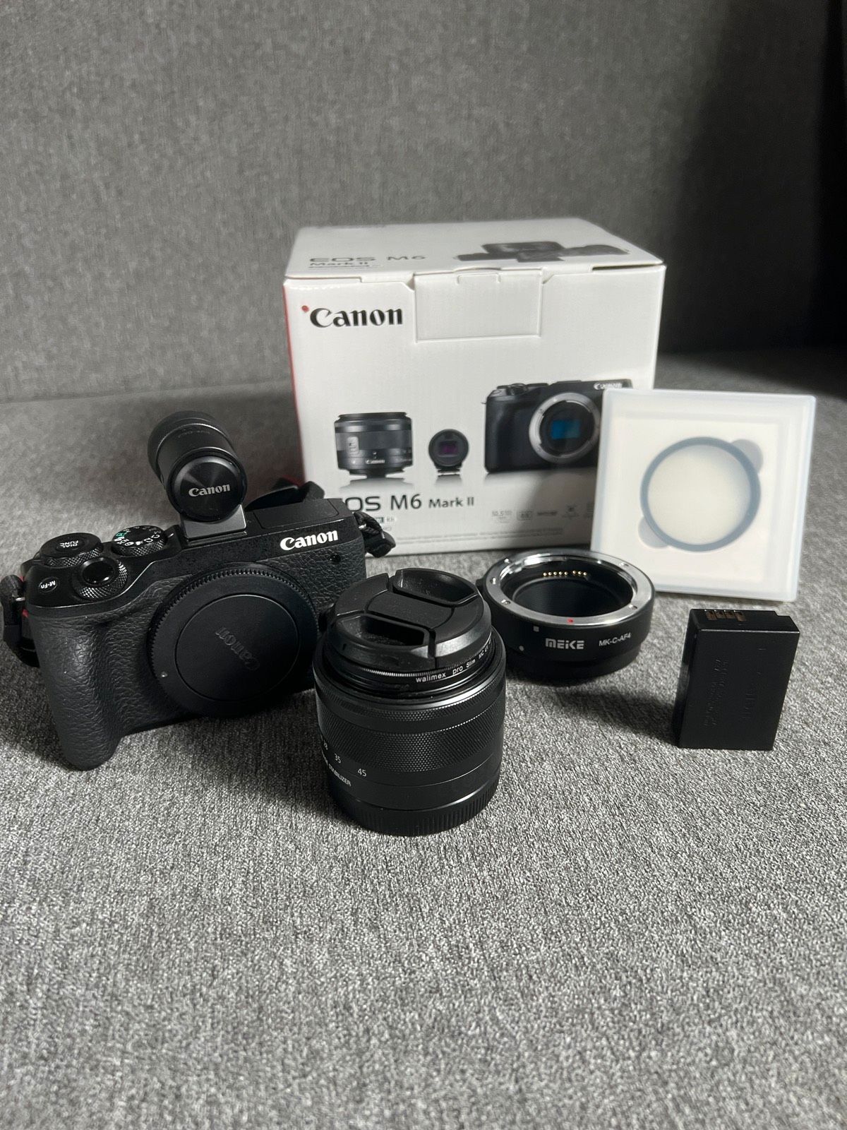 Mit dabei ist der passende elektronische Canon Sucher, das Kit Objektiv, ein Bajonett-Adapter für EF-S und EF Objektive, 2 Schutzgläser für das TouchDisplay und ein UV+Schutz Filter.Die Linse und das TouchDisplay wurde von Anfang an mit Schutzgläsern versehen und sind daher ohne jegliche Beschädigungen oder Kratzern.