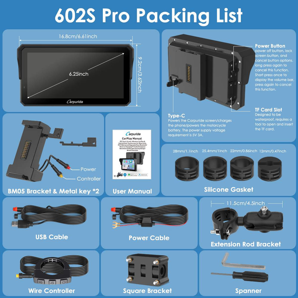 【Plug-and-Play & Kabelgebundener Controller】: Der CarPlay-Bildschirm des Carpuride W602S Pro für Motorräder verfügt über die verbesserte BM05-Halterung. Nach der Installation lässt er sich jederzeit bequem mit dem mitgelieferten Metallschlüssel bedienen. Zum Schutz vor Diebstahl kann der Bildschirm beim Parken abgenommen und zum Weiterfahren einfach wieder eingesetzt werden – ganz nach Ihren Wünschen. Dank der kabelgebundenen Fernbedienung können Sie Anrufe annehmen, den Bildschirm ein- und ausschalten sowie zwischen Startseiten und CarPlay-Oberflächen wechseln – alles per Knopfdruck. Hinweis: Dieses Produkt unterstützt keine Rollensteuerung und verfügt über keinen Reifendrucksensor.