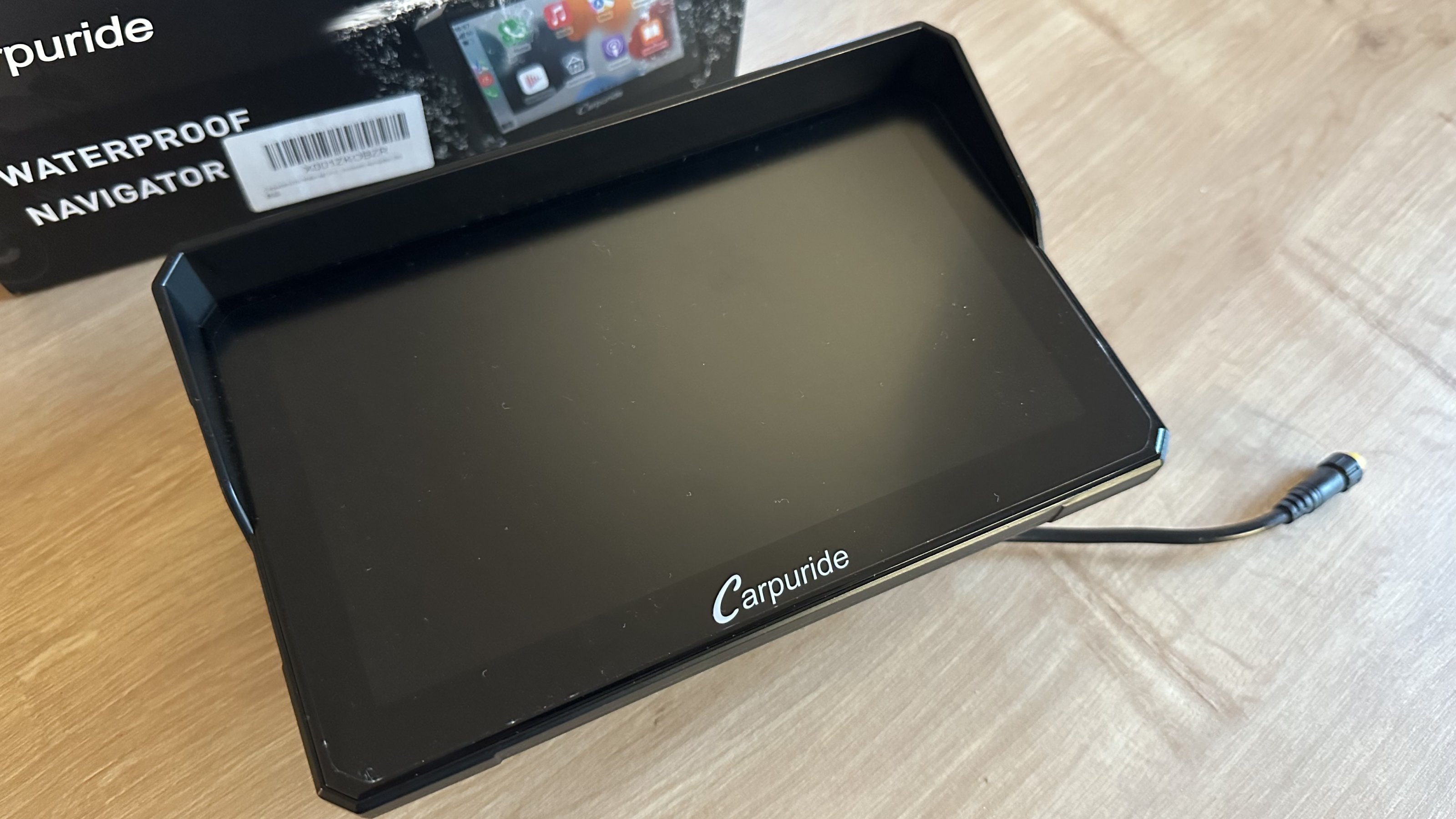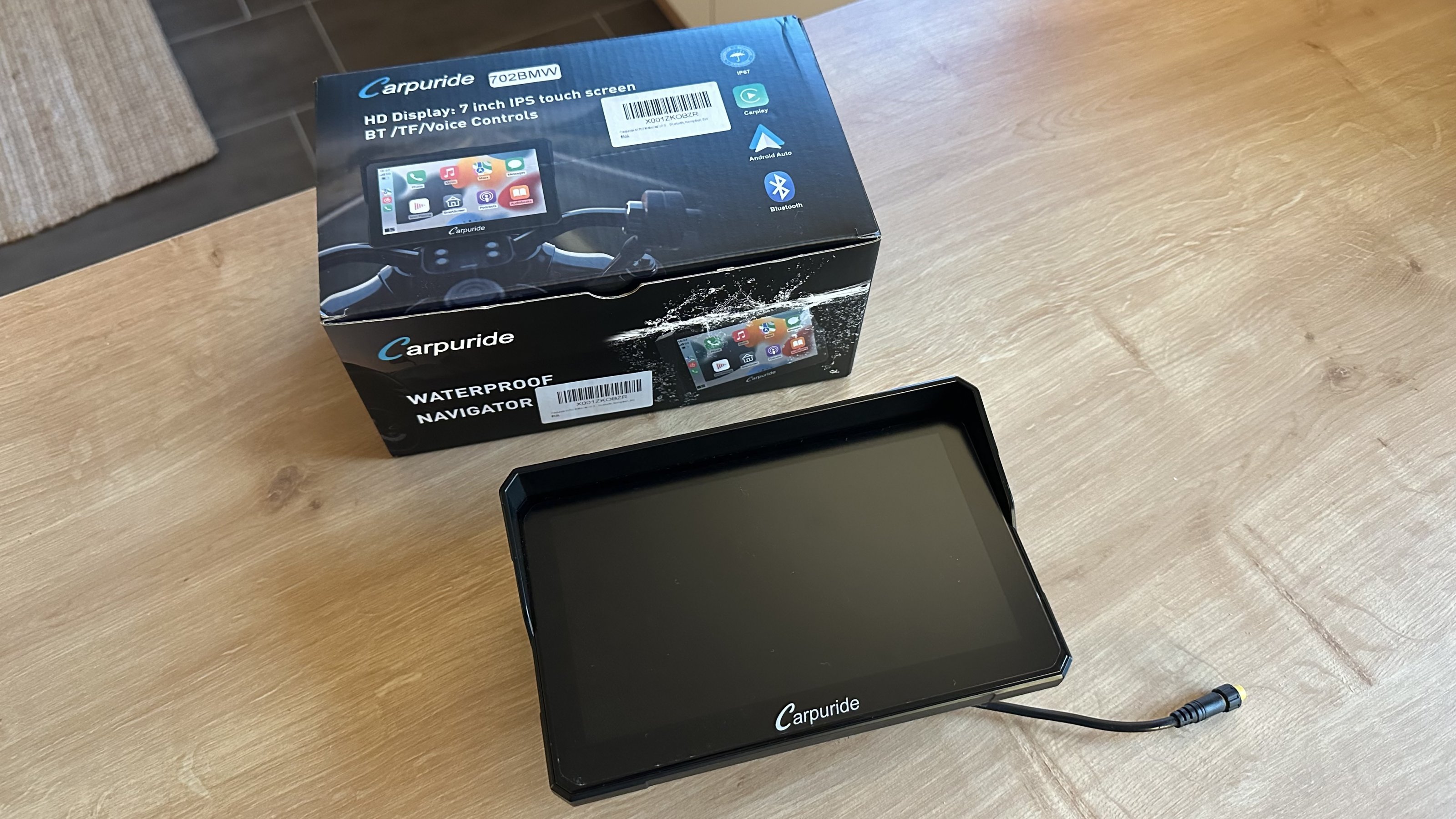 Mit dabei der BMW Adapter und eine aufgeklebte Matte Schutzfolie um Spiegelungen zu unterdrücken.
