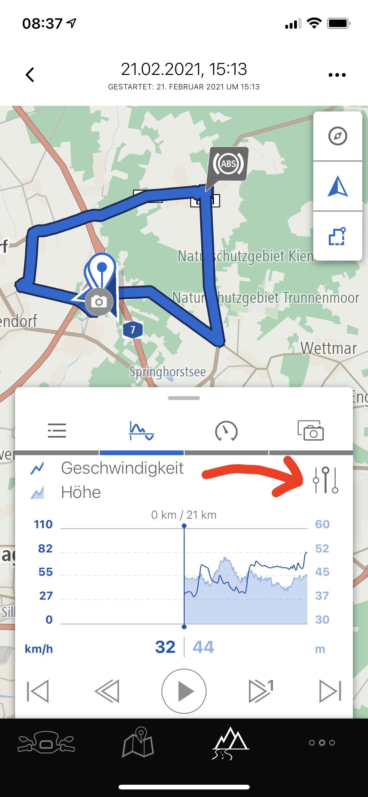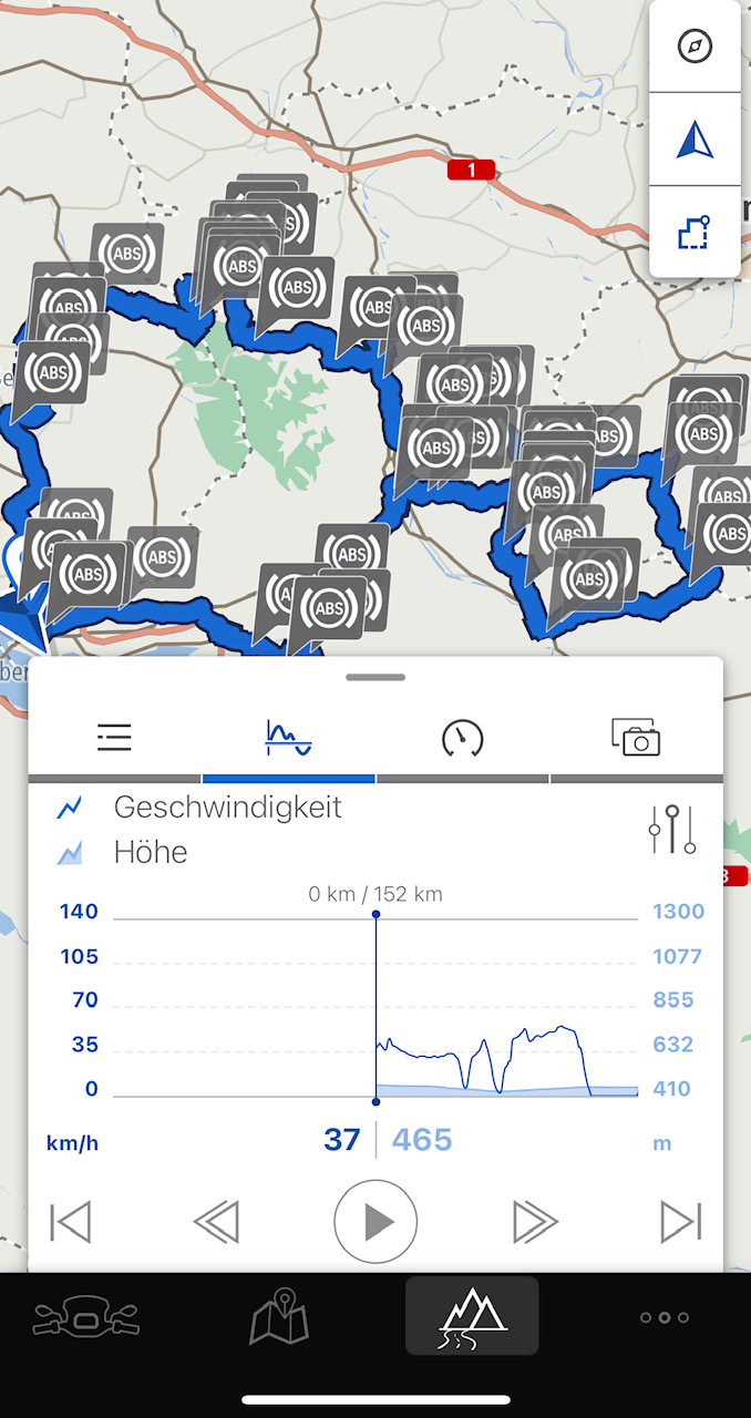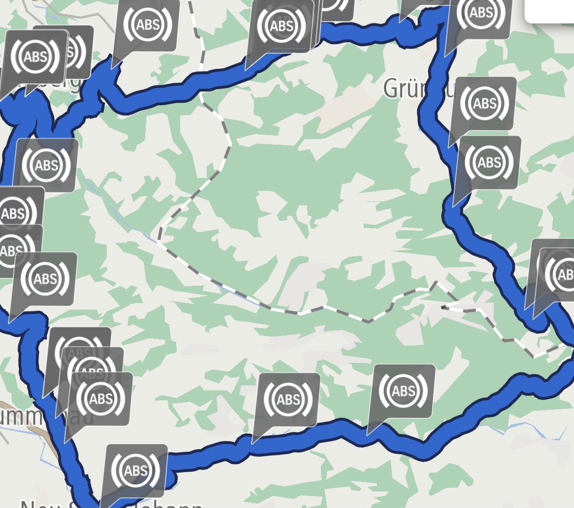 GrußRichtig. Habe es gleich eingestellt wie du, aber die Schräglageninfo einfach auch noch dazugeklickt. So habe ich es dann eben gesehen, mit diesen vielen ABS Zeichen. Auf deiner kurzen Strecke hast du nur gerade einmal 1 ABS Symbol. Ich habe hier mal noch ein Bild auf einer 152Km Tour angehängt. Irgendwie irritieren mich diese vielen ABS Eingriffe. Wie gesagt, sei das gemäss Händler normal… Bei dir gabs auf 21Km gerade mal nur diesen Einen Eingriff.