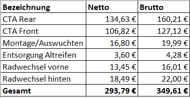 Und wenn man das alles selber macht spart man sich das Geld und verbraucht die eigene Zeit. Dafür habe ich Spaß daran und weiß, dass es ordentlich gemacht ist weil ich mir Zeit dafür nehme. Auch muss ich nirgends hin fahren und brauche keinen Termin. Wenn ich Lust habe kann ich meine Reifen auch Nachts um 11 wechseln oder am Sonntag morgen.