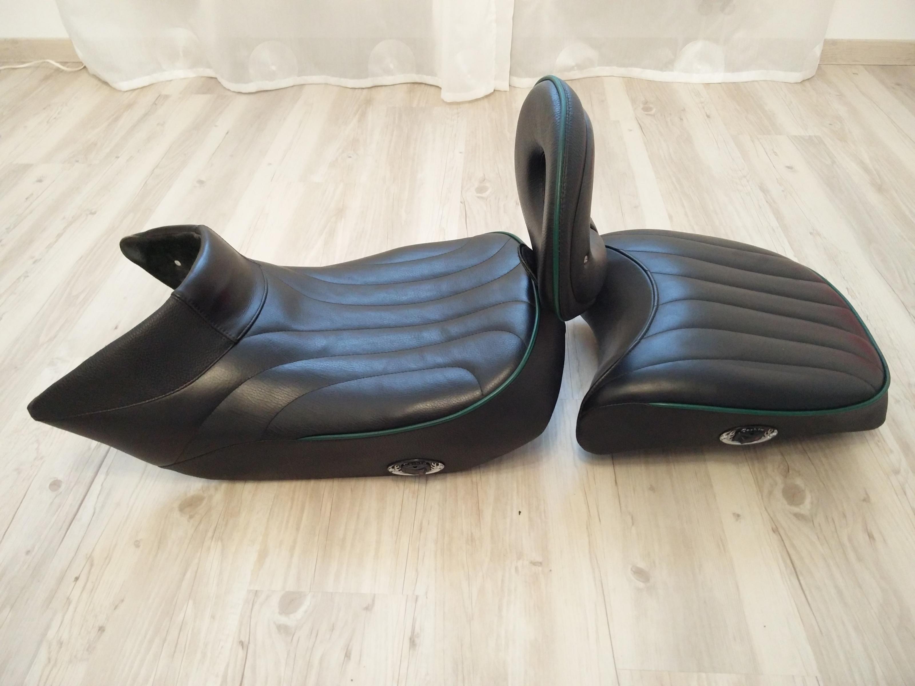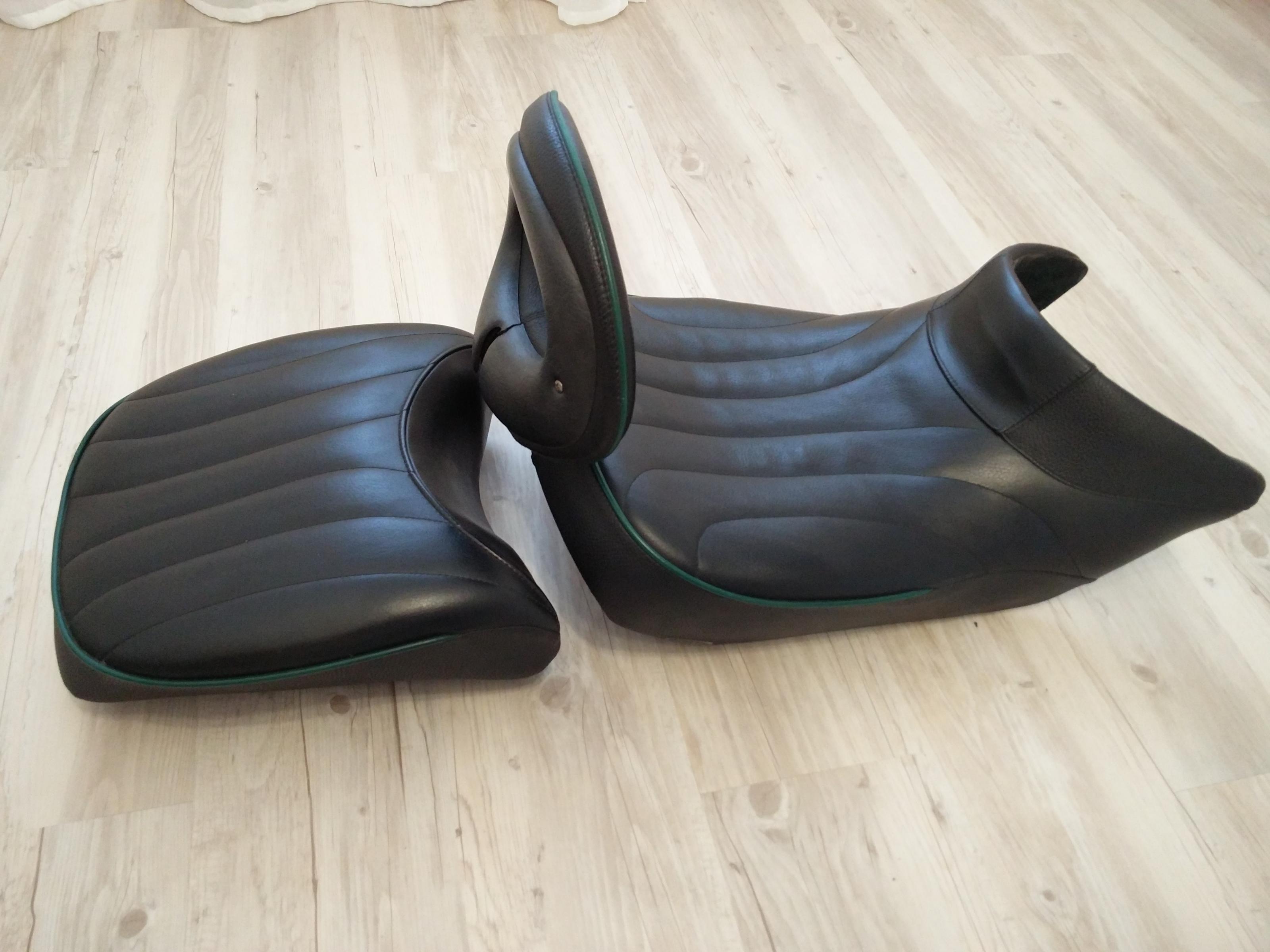 Alle drei Teile sind aus schwarzem Echtleder mit dunkelgrünen Kederbändern. Diese können problemlos mit einem Lederfärbemittel in schwarz geändert werden. Die Bank ist in einem guten gepflegten Zustand ohne Beschädigungen (vgl. dazu die Fotos).