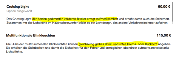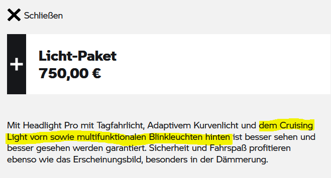 Wenn ich mir die Rückleuchten (und teilweise auch die Frontleuchten) moderner Autos anschaue, brauche ich mir um Crusing Lights an Motorrädern keine Gedanken zu machen. Man sieht die Blinker (wenn überhaupt) nur, wenn man direkt hinter dem Auto fährt, teilweise auch erst dann, wenn das Bremslicht aus ist.