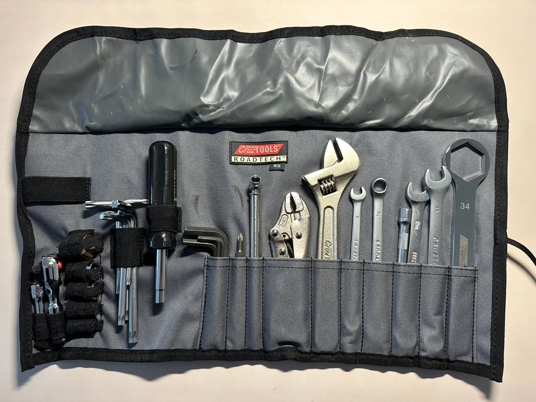 Dieses Set enthält einen 34-mm-Achsschlüssel, einen vierstufigen Sechskant-Achsadapter mit 10 mm, 12 mm, 19 mm und 22 mm Größen in einem kompakten Werkzeug, 6 Torx-Schlüssel, 5 Sechskantschlüssel, 4 metrische Schraubenschlüssel, eine Mini-Ratsche mit 5,1 cm Verlängerung und 4 Stecknüsse. Abgerundet wird das Set mit einem 6-in-1-Schraubendreher, Feststellzange, verstellbarem Schraubenschlüssel.