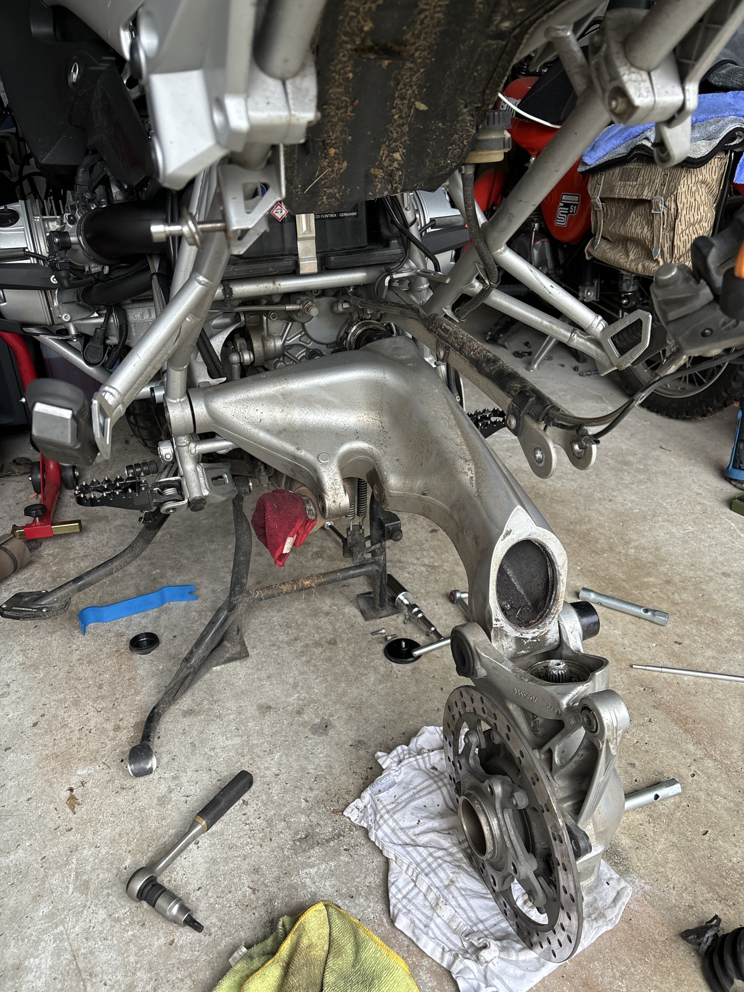 ich habe letzte Nacht noch angefangen die Schwinge abzubauen und bin (hoffentlich) nur eine Schraube davon entfernt.