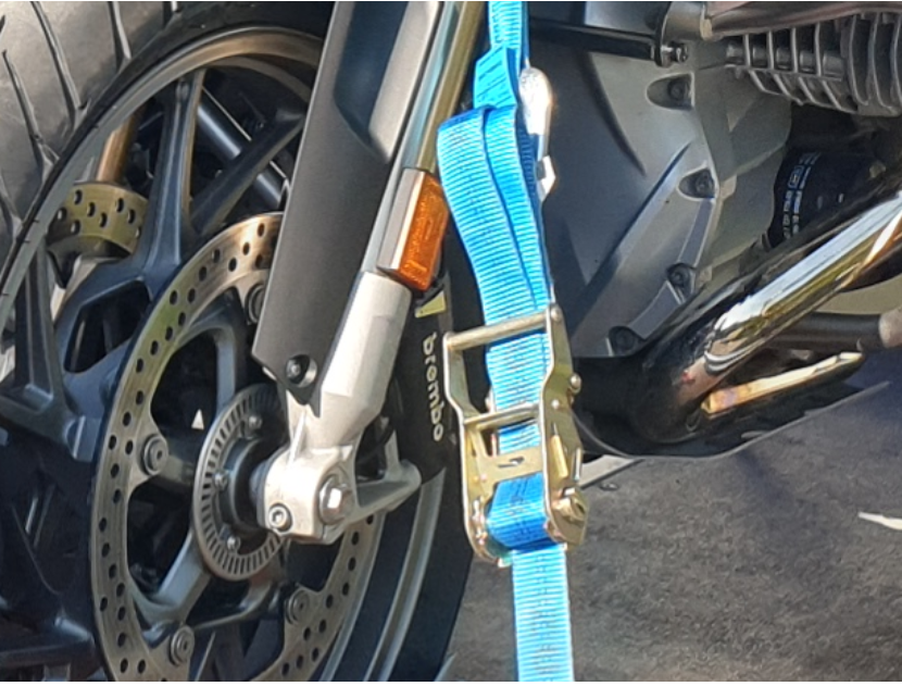 Ich habe extra Gurte gekauft, die ausschließlich zum Transport unserer 2 Motorräder gedacht sind.