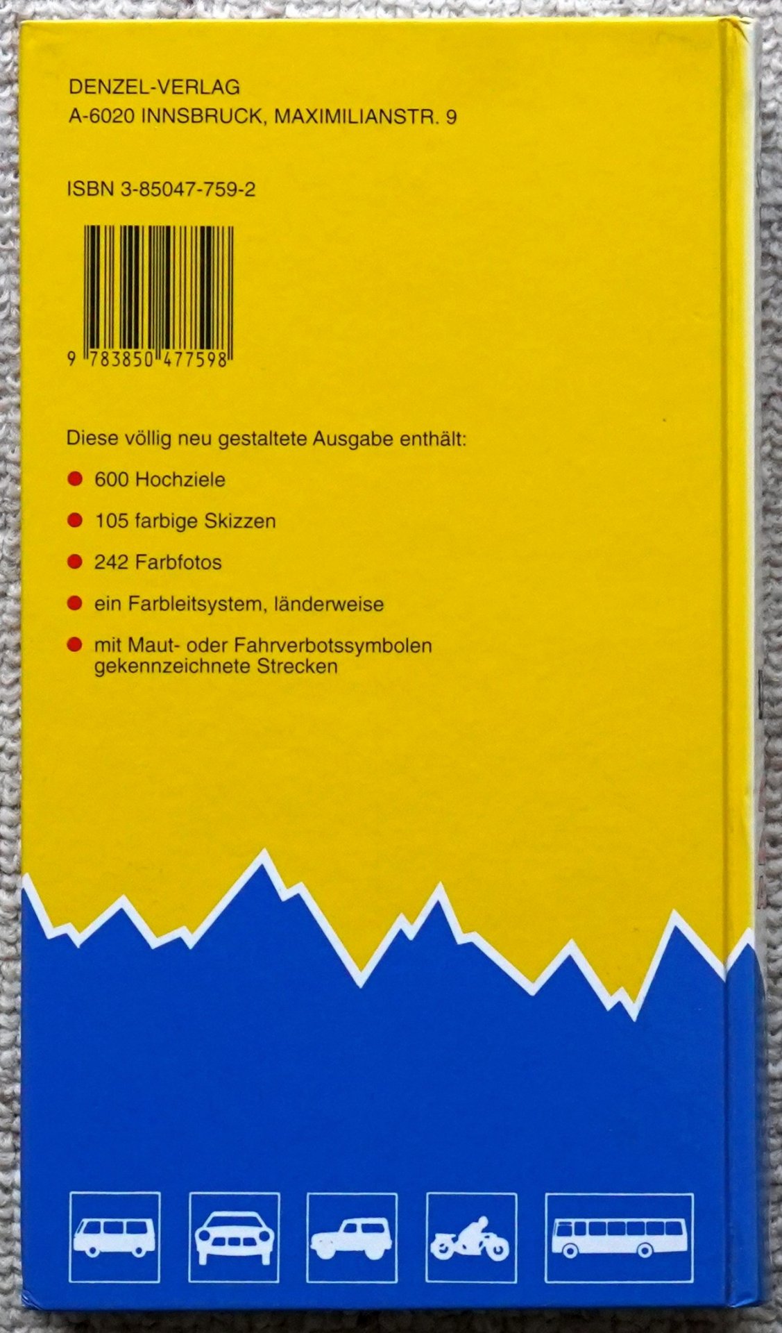 Grosser Alpenstrassenführer die anfahrbaren Hochpunkte der Alpen und die kuriosesten Gebirgsstrecken zwischen Wien und Marseille für sportlich-touristisch eingestellte Auto- und Zweiradfahrer Texte: Eduard Denzel ; Harald Denzel Völlig neu gestaltet und aktualisiert hrsg. von Harald Denzel 20. Ausg. Innsbruck : Denzel 1999 560 S. 22 cm ISBN: 978-3-85047-759-8