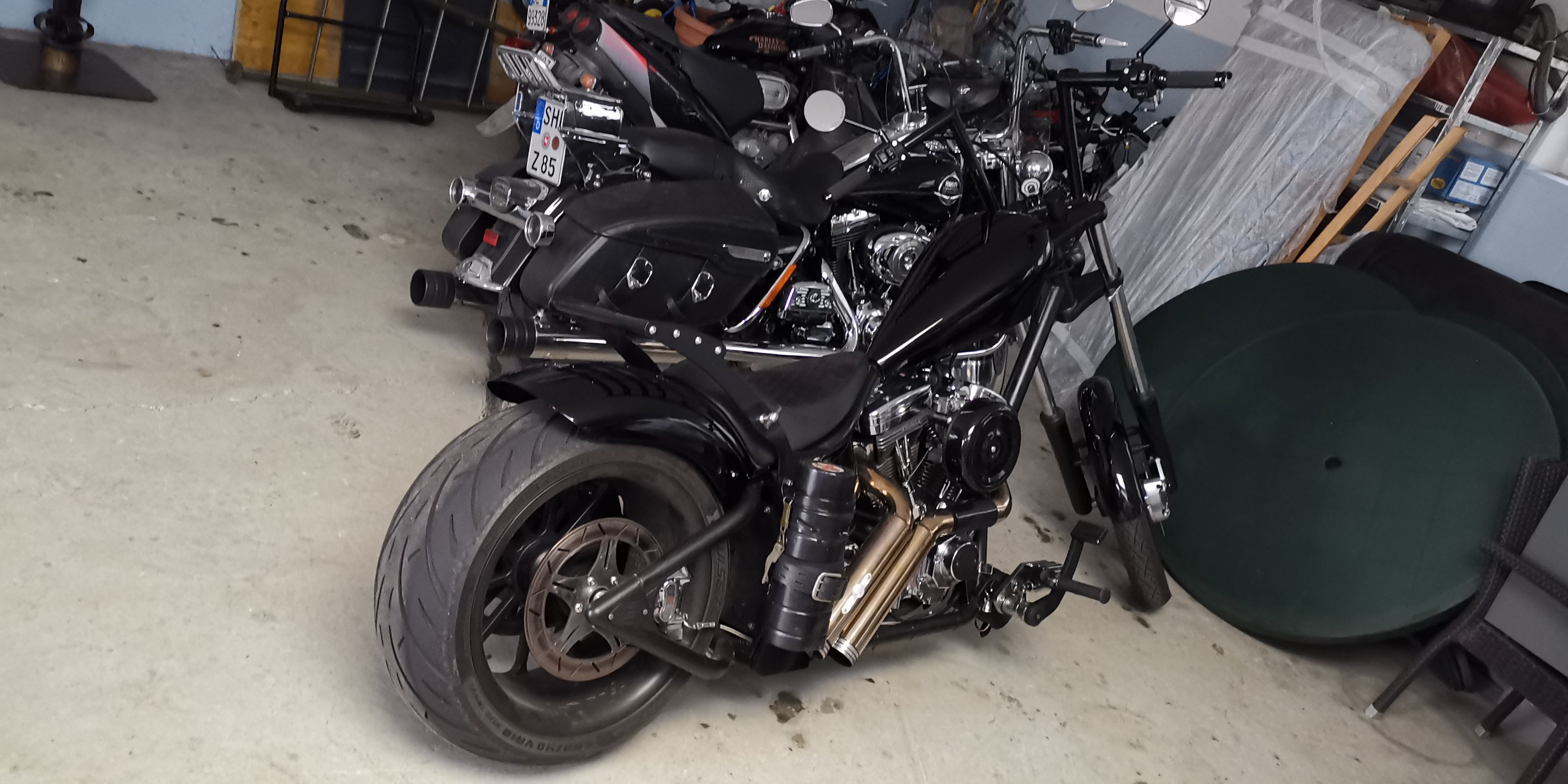 Hätte ich Geld über, würde ich mir z.B. so ne Walz Harley auch gern in die Garage stellen. Hier aber mit ner human blubbernden Auspuffanlage. Diese blanken Rohre müssen nun echt nicht sein.