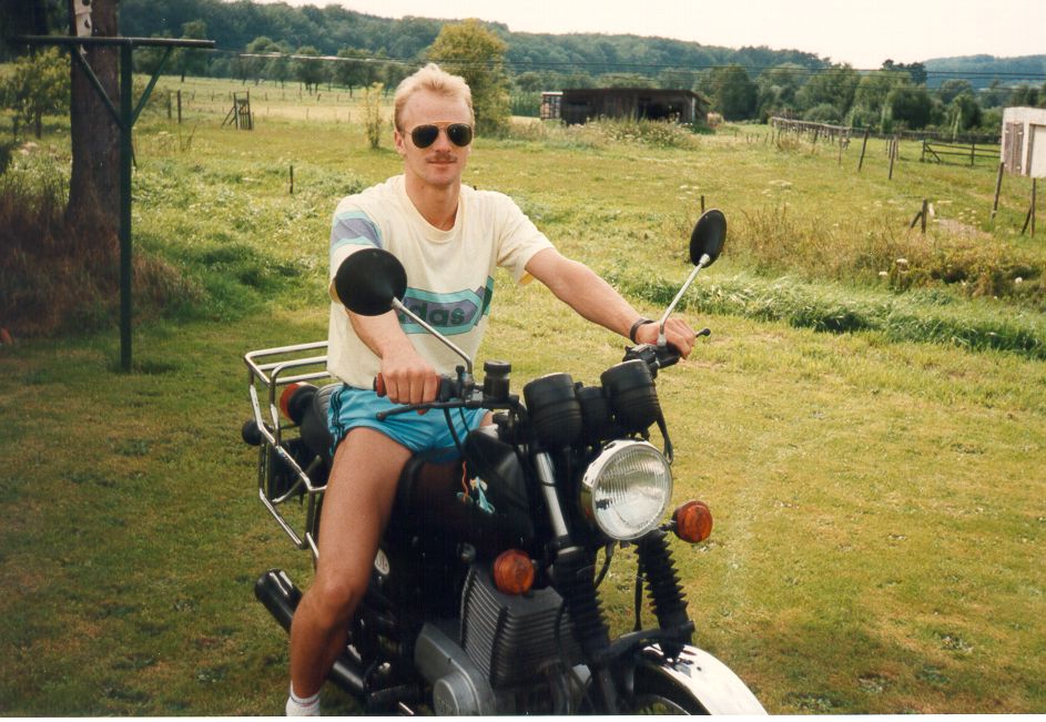 Dann will ich auch mal ein Foto hochladen - mit meinem ersten Motorrad im zarten Alter von 20 Jahren - mit vollständiger Kopfbehaarung und Schnurrbart- der Rest passt noch halbwegs
