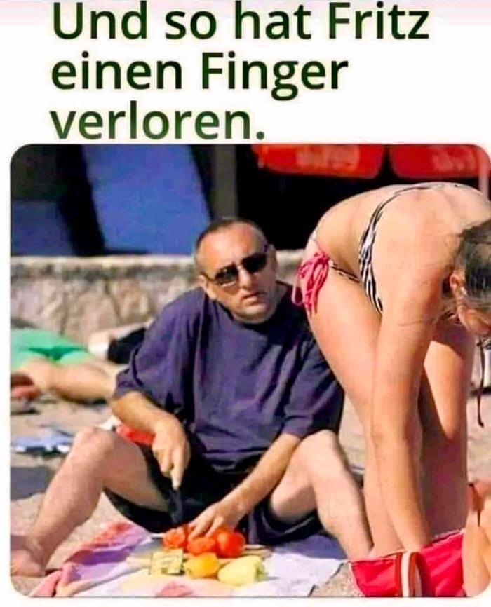 Das ist seine Tarnung als Spanner und Lustmolch.will der da eigentlich kochen oder warum schneidet der das ganze Gemüse am Strand???