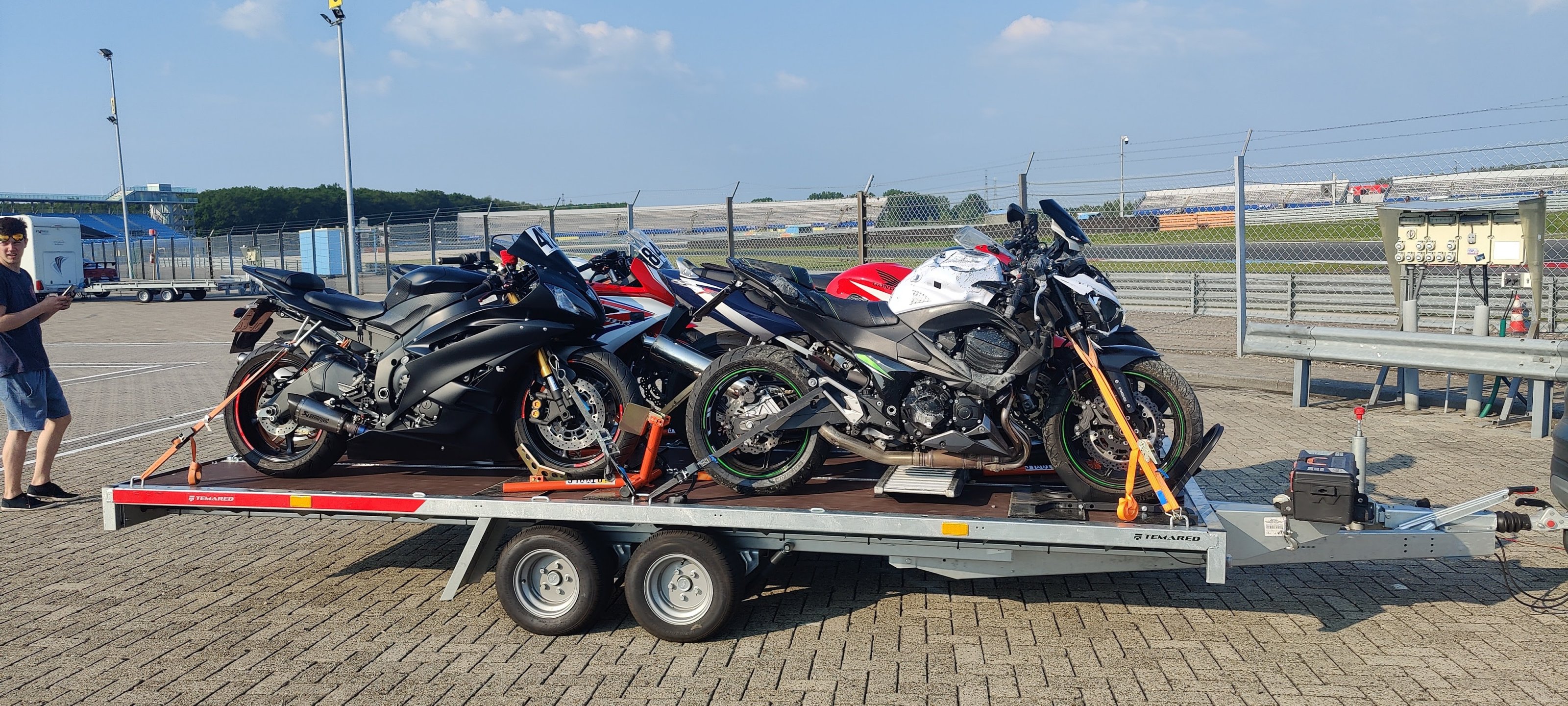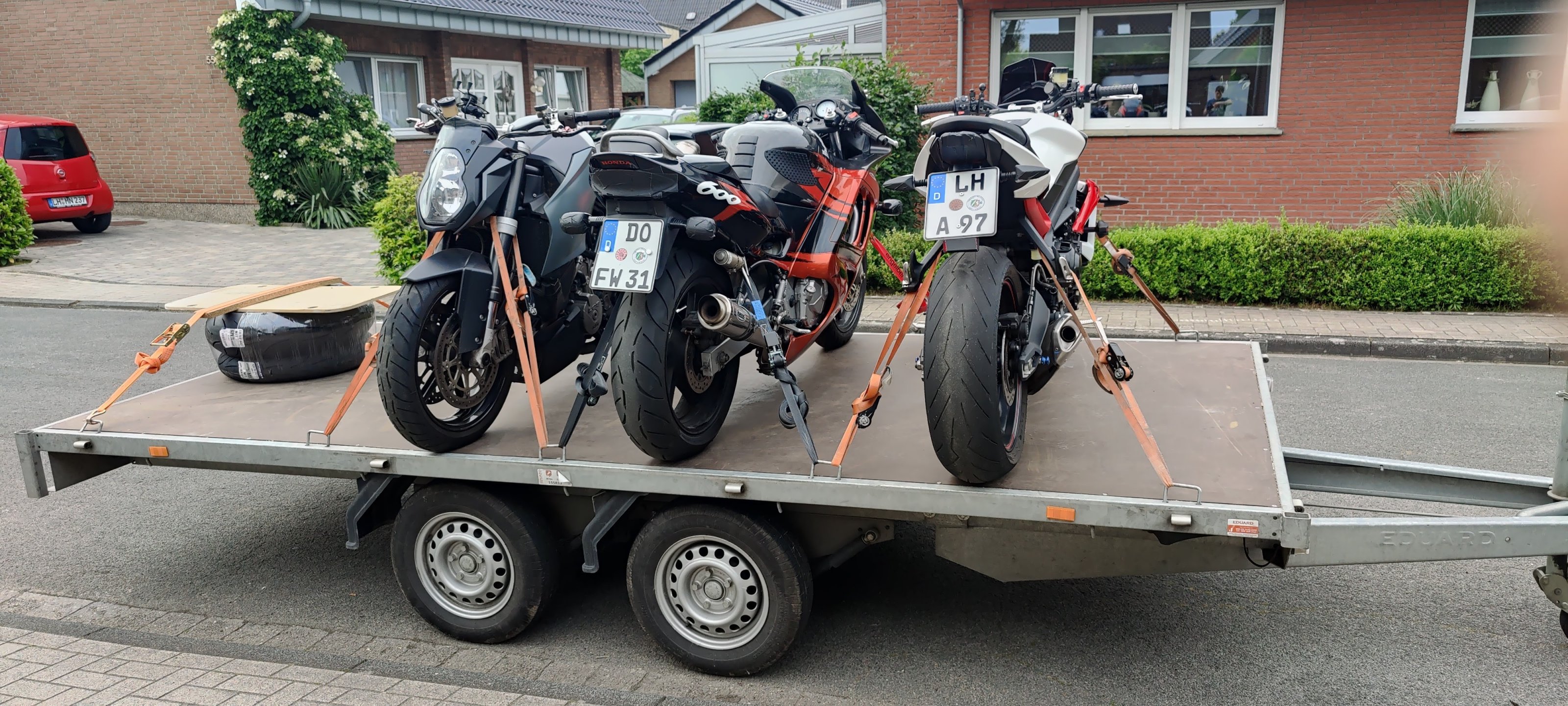 Durch den sehr tiefen Schwerpunkt und Beladungshöhe, ist der Anhänger sehr leicht ... auch alleine ... zu be- und end laden und die Mopeds sind in 10 Minuten verzurrt ... das Eiler Zurrsystem für hinten spart da echt viel an Zeit und funktioniert super.