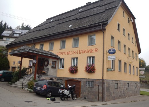 Die Uhr schreitet langsam aber sicher voran. Es ist mittlerweile fast 17:00 Uhr und es wird Zeit, dass ich mir eine Unterkunft suche. Allerdings nicht auf der Schweizer Seite. Das ist mir doch zu teuer. Also zurück über die Grenze nach Deutschland. In diese Richtung wird zum Glück nicht kontrolliert und auch von Radarfallen bleibe ich verschont. Es ist allerdings gar nicht so einfach eine Unterkunft zu finden. Beim ersten Versuch bekomme ich noch vor der Tür von der Wirtin die Auskunft, dass man seit dem letzten Jahr keine Zimmer mehr vermiete. Den zweiten Anlauf breche ich ab, als ich feststelle, dass der Parkplatz des Hotels komplett belegt ist. Hier lohnt es sich offensichtlich nicht vom Motorrad abzusteigen. Fündig werde ich kurze Zeit später in Hammereisenbach. Ein kleiner Gasthof mit gemütlicher 1950er Jahre Atmosphäre, inkl. Zimmer mit Nierentisch, kleinen Cocktail-Sesseln und auch Preisen aus dem Jahrzehnt des Rock´n Roll. Ein Einzelzimmer mit Frühstück für 20 Euro, ein Schnitzel mit Beilage für 9,- und ein großes Bier für 2,- Euro. Was will man mehr? Nun ja...Ein wenig Unterhaltung in Form eines Fernsehers, von mir aus auch stilecht in schwarz-weiß, wäre schon nicht schlecht....Aber so verbringe ich den Abend nach dem Essen mit einem Kriminalroman in der Gaststube und bin die Attraktion des Abends für den dort tagenden Landfrauenverein....
