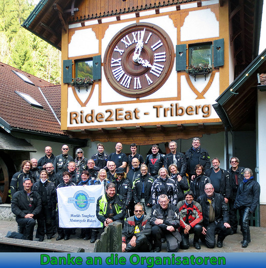 Nachdem ich mein Gepäck aufs Zimmer gebracht habe, mache ich mich kurze Zeit später schon wieder auf den Weg nach Triberg. Vor der weltgrößten Kuckucksuhr soll um 16:00 Uhr das Treffen für das Gruppenfoto statt finden. Einige Motorräder und ihre Fahrer sind schon da, als ich gegen 15:30 Uhr dort eintreffe. Obwohl ich niemanden persönlich kenne, bin ich schnell in nette Gespräche verwickelt. Das Gruppenfoto gestaltet sich recht aufwändig. Ein zufällig in der Nähe stehender Tourist wird in die Pflicht genommen, die Aufnahme zu machen. Ob der nette Herr eingewilligt hätte, wenn er geahnt hätte, dass er die Aufnahme mit einem knappen dutzend Fotoapparaten wiederholen muss, darf bezweifelt werden...