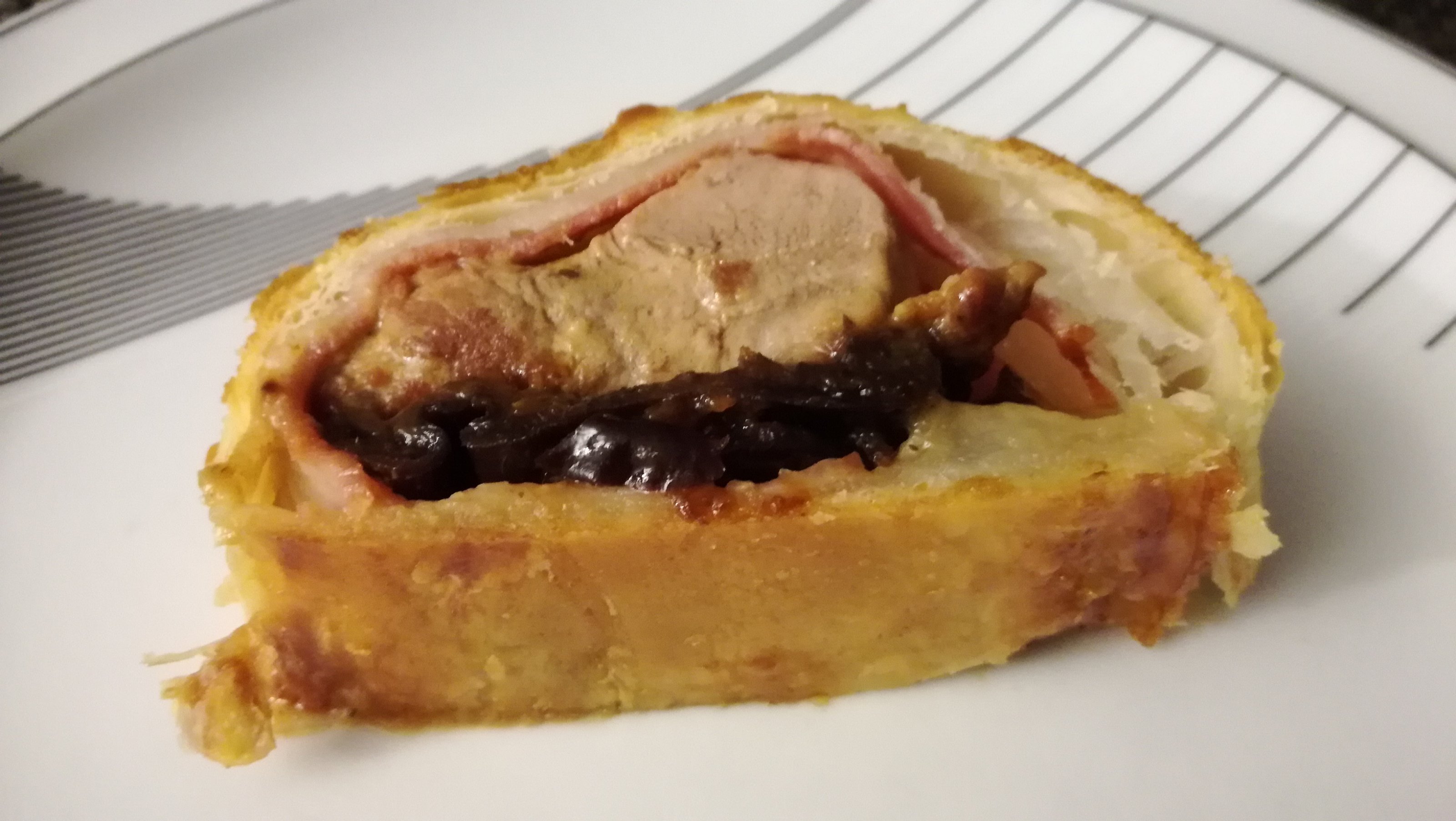 ) ein Schweinefilet mit Speck und Dörrzwetschgen im Teig.